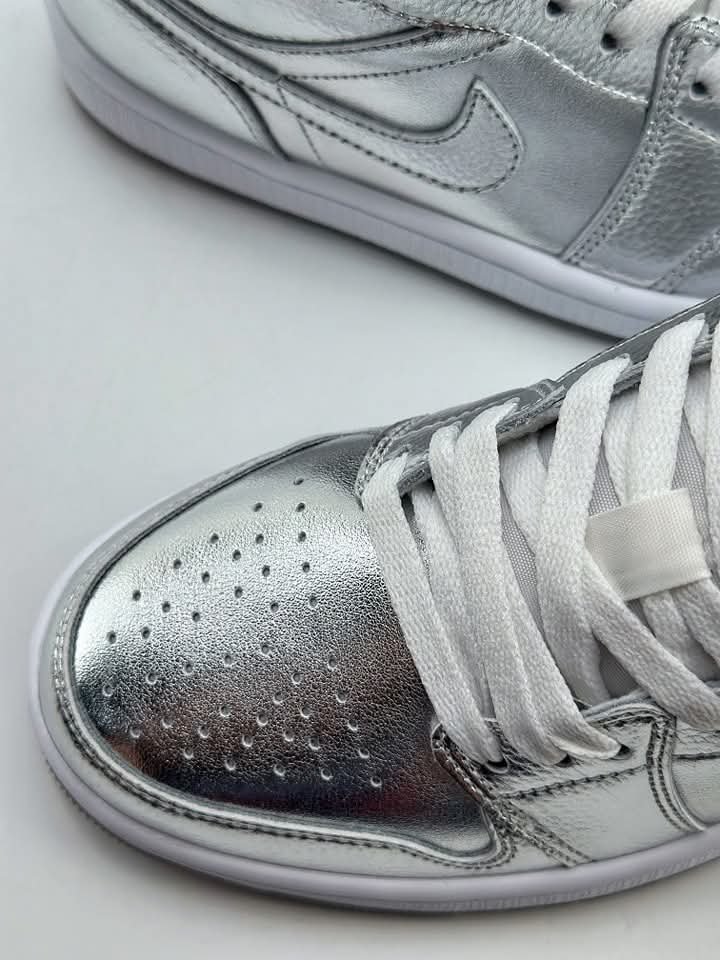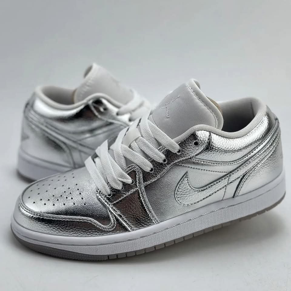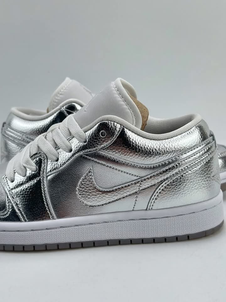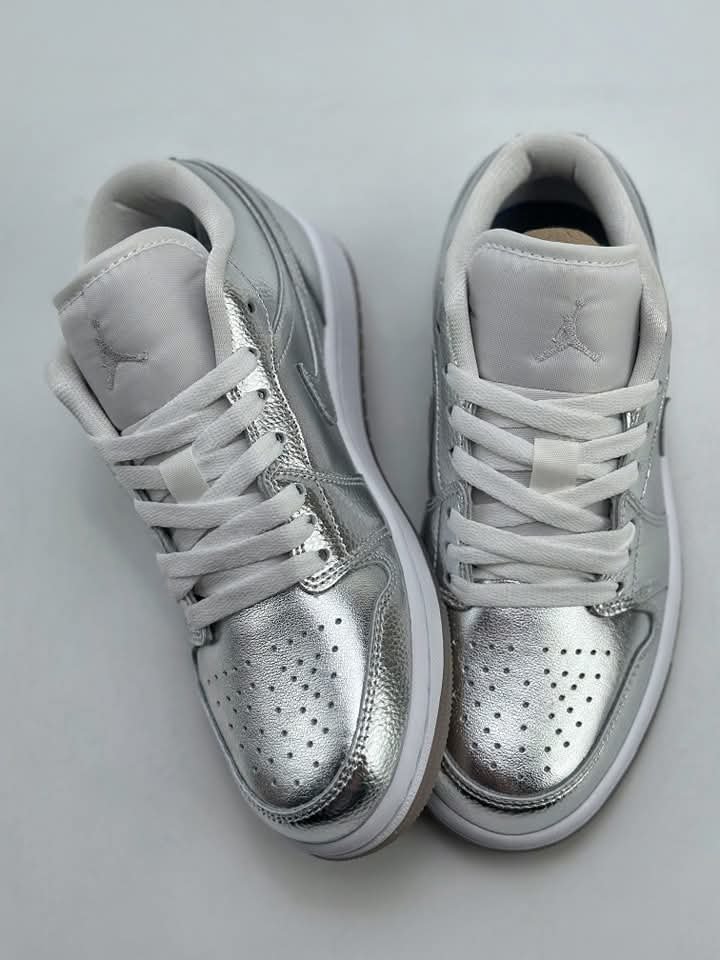 Sneakers Air Jordan 1 Low argent métallisé, en cuir brillant premium avec semelle blanche confortable. Un modèle stylé et moderne pour un look urbain remarquable.