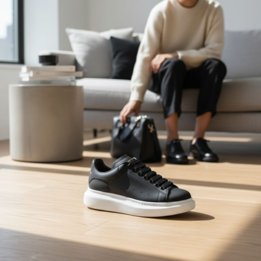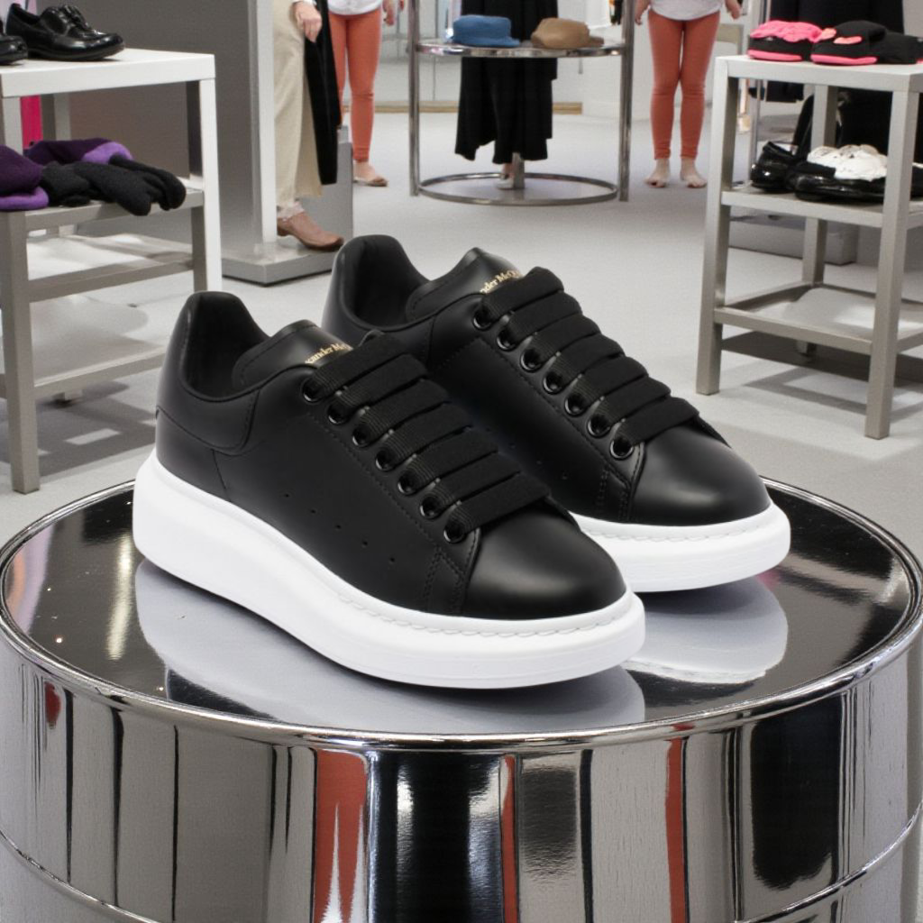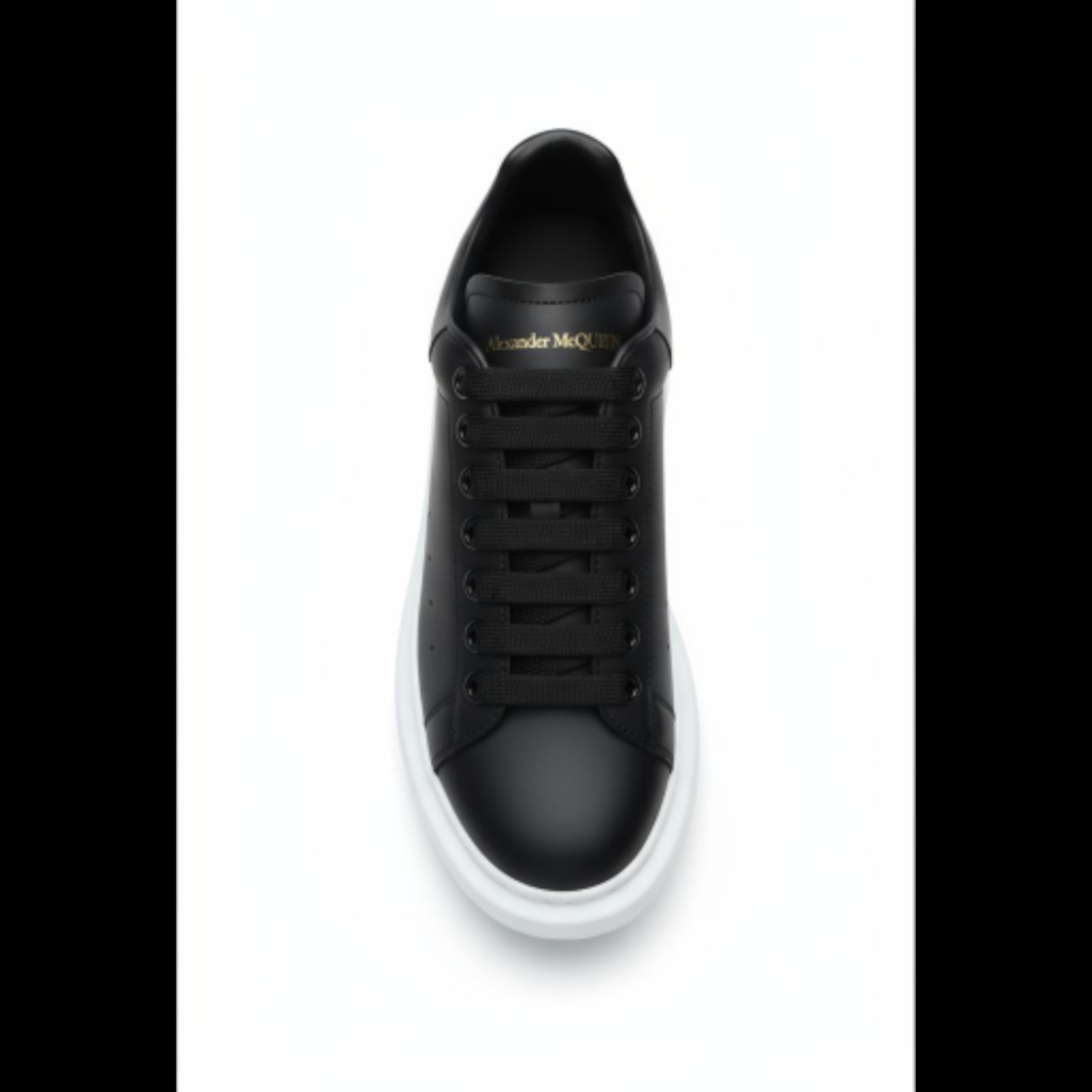 Découvrez l’emblématique Sneaker Oversize d’Alexander McQueen, une pièce maîtresse qui fusionne luxe contemporain et design urbain audacieux. Cette version intemporelle arbore une tige en cuir de veau lisse noir de la plus haute qualité, offrant une élégance sobre et une durabilité exceptionnelle.