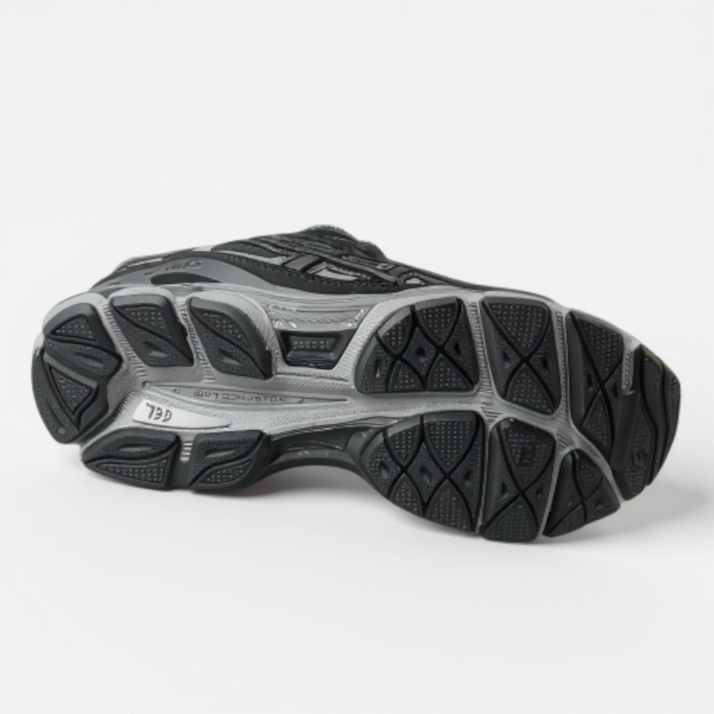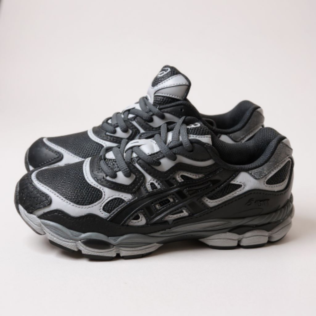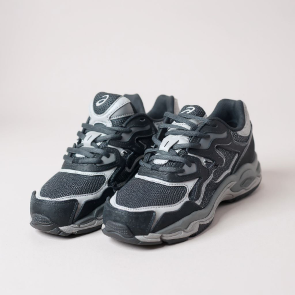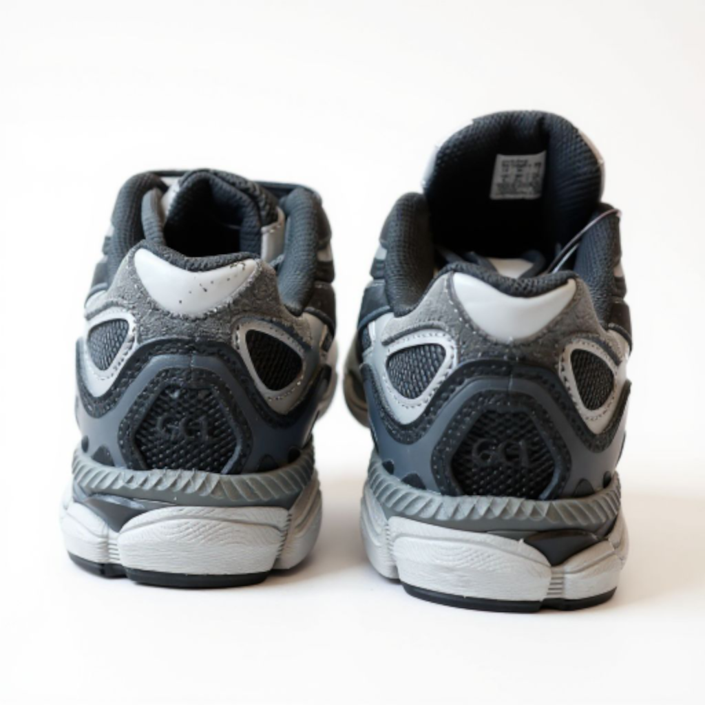 Design Rétro Authentique: La silhouette s’inspire clairement des modèles de course du début des années 2000, avec une construction superposée de maille respirante (noir/gris foncé) et de panneaux synthétiques/cuir (gris clair) pour un look à la fois robuste et dynamique. Les lignes fluides et le logo ASICS latéral (visible sur l’image de profil) ajoutent une touche sportive et reconnaissable.