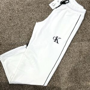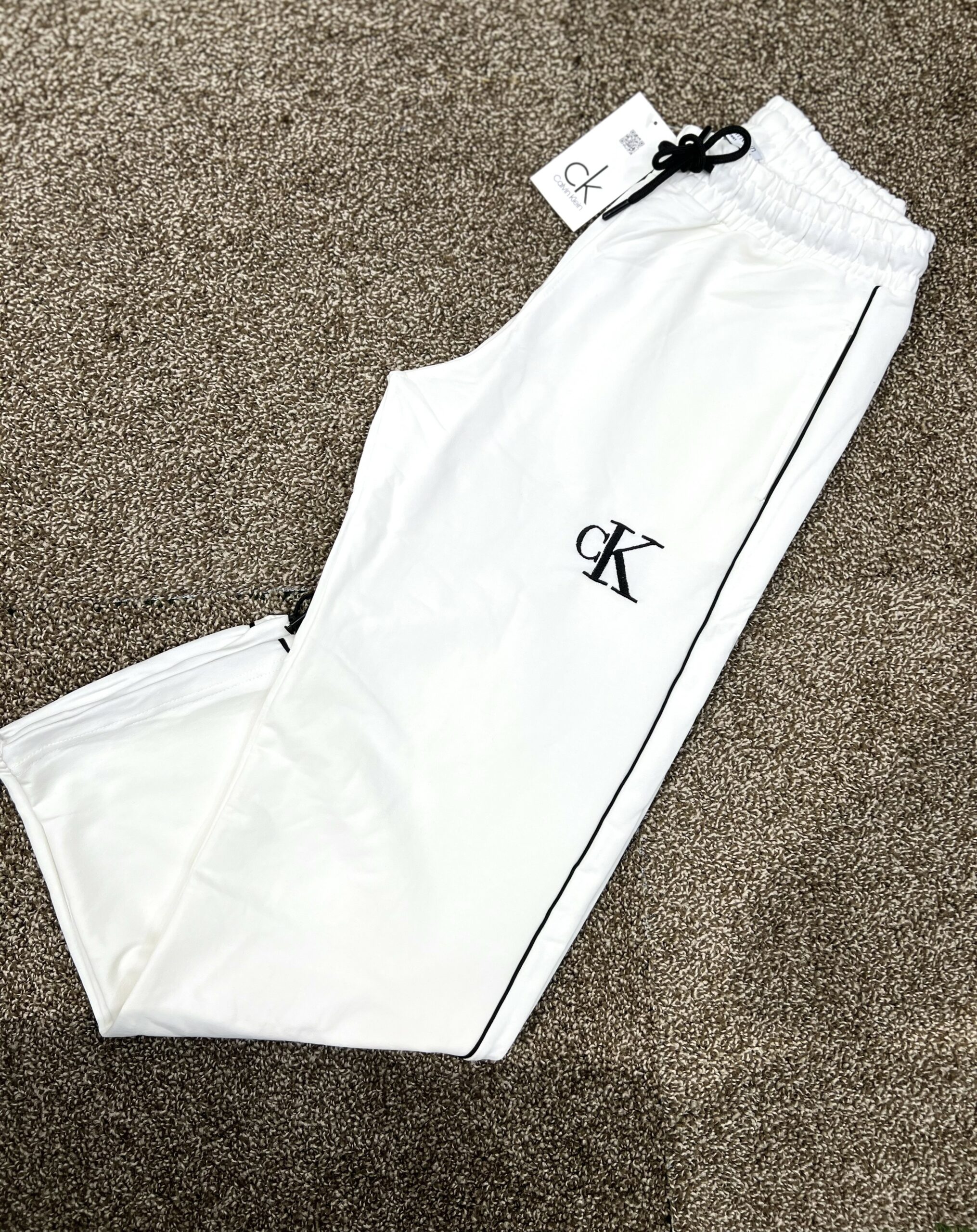 Pantalon de survêtement blanc doux avec le logo CK brodé et une élégante bande latérale noire. Un style athlétique épuré pour un confort maximal.