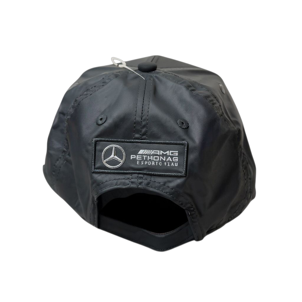 L’arrière est brodé d’un patch rectangulaire en silicone ou caoutchouc affichant le logo et le texte « AMG PETRONAS ESPORTS TEAM ».
