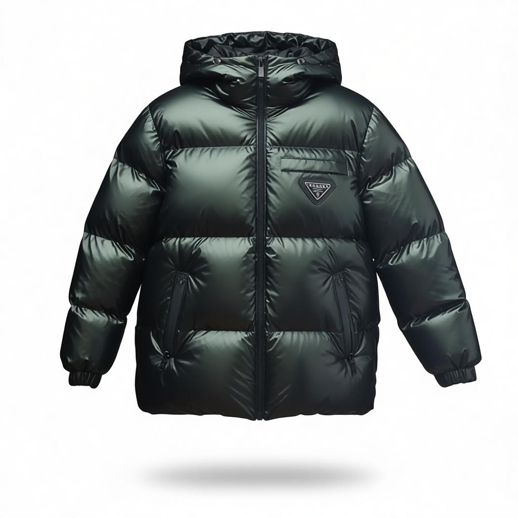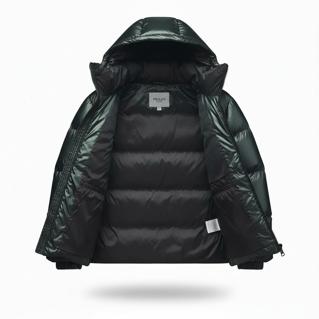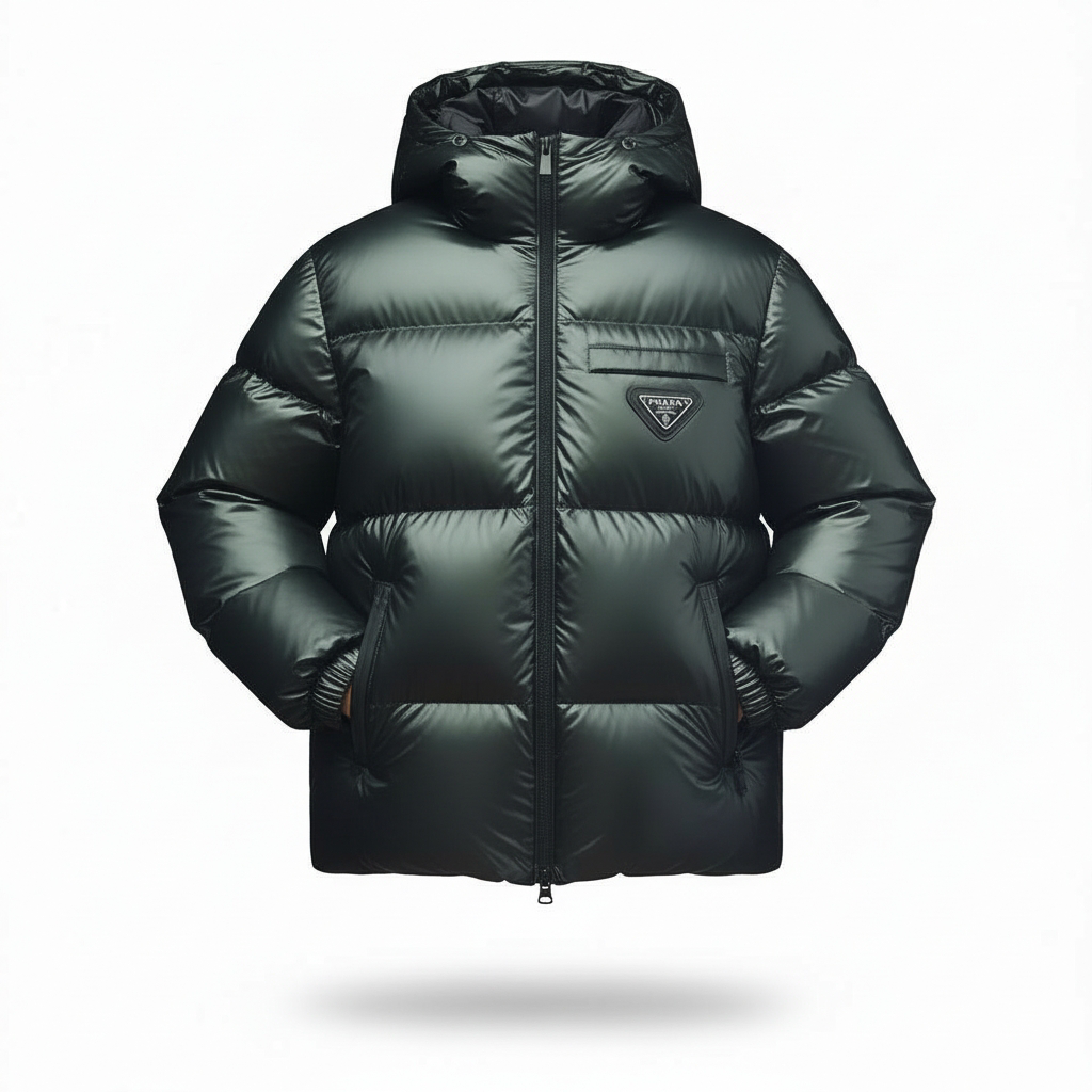 - Design & Style : Coupe moderne légèrement bouffante avec un fini brillant effet « laqué ». Elle arbore l’emblématique logo triangulaire Prada sur la poitrine.