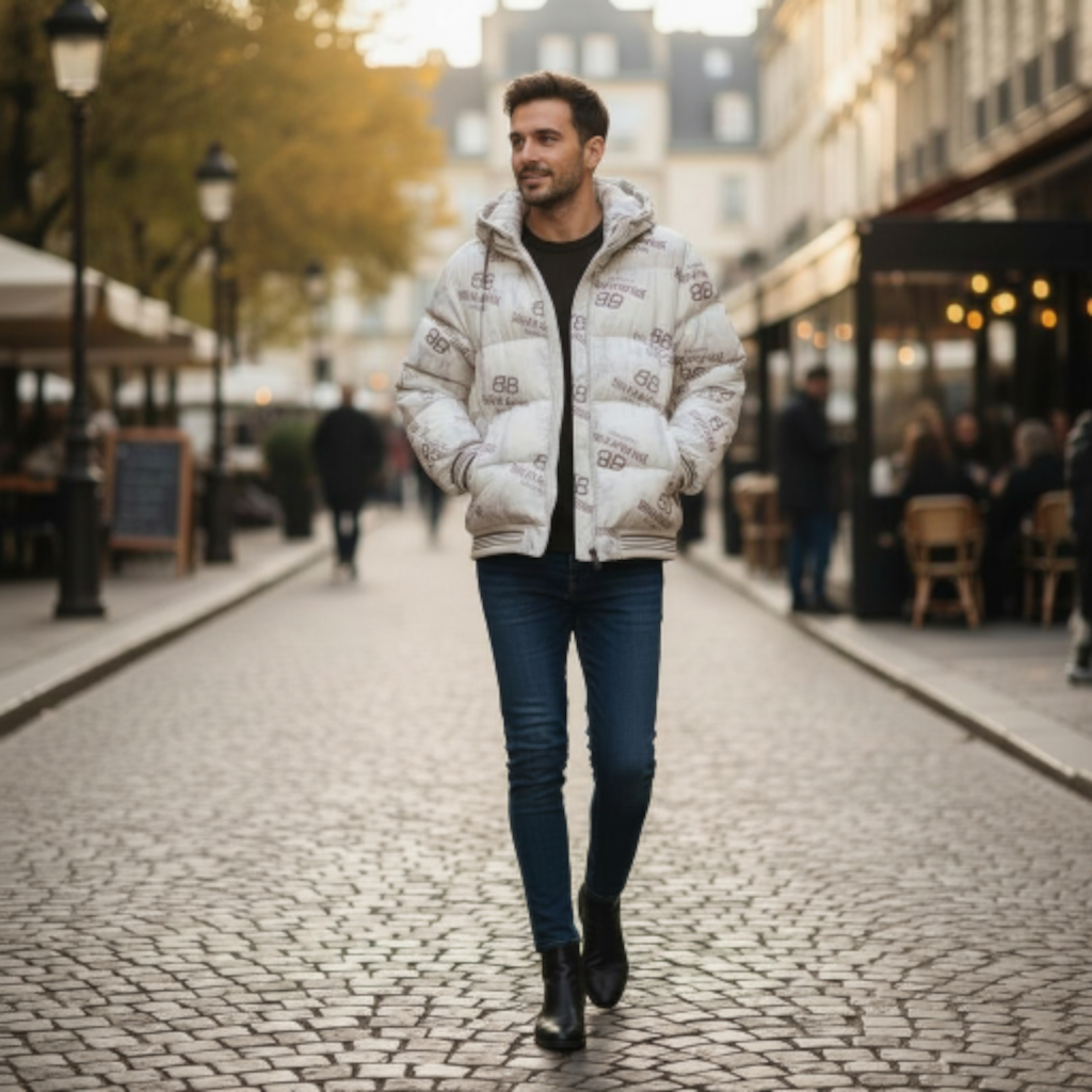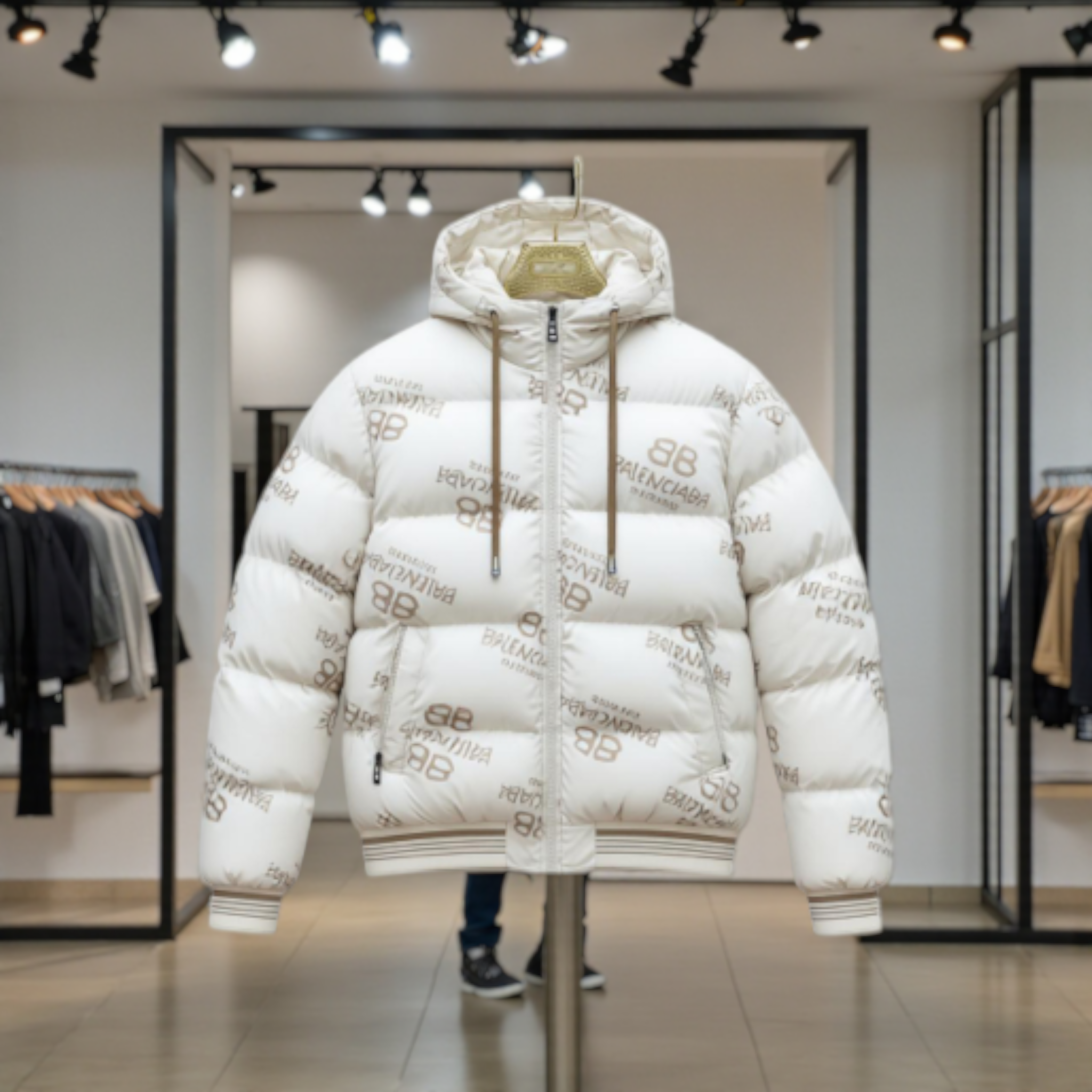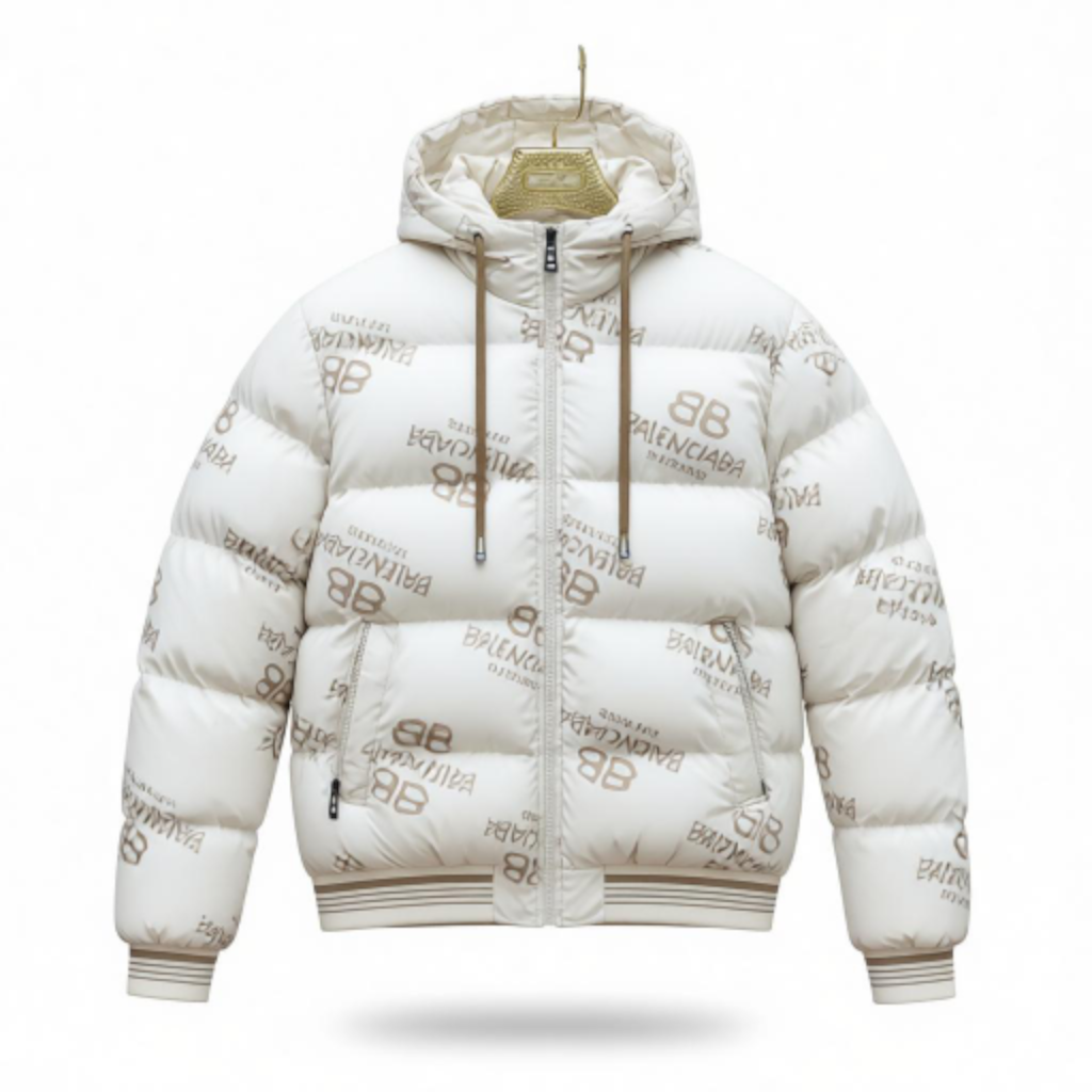 Affirmez un style chic et contemporain avec cette doudoune bomber à la teinte Crème/Écru lumineuse. Contrairement au modèle noir, cette version offre une esthétique plus douce tout en restant audacieuse grâce à son motif intégral (all-over). Le logo « BB » et l’inscription « BALENCIAGA » sont imprimés dans des tons Marron/Taupe contrastants, créant un effet visuel texturé et sophistiqué.