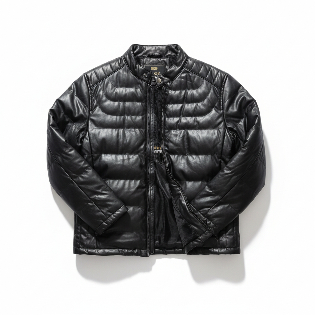 Cette pièce unique combine l’aspect robuste du blouson de motard et le confort thermique d’une doudoune. Sa finition noire satinée apporte une touche de luxe immédiate à toutes vos tenues, qu’elles soient décontractées ou plus formelles.
