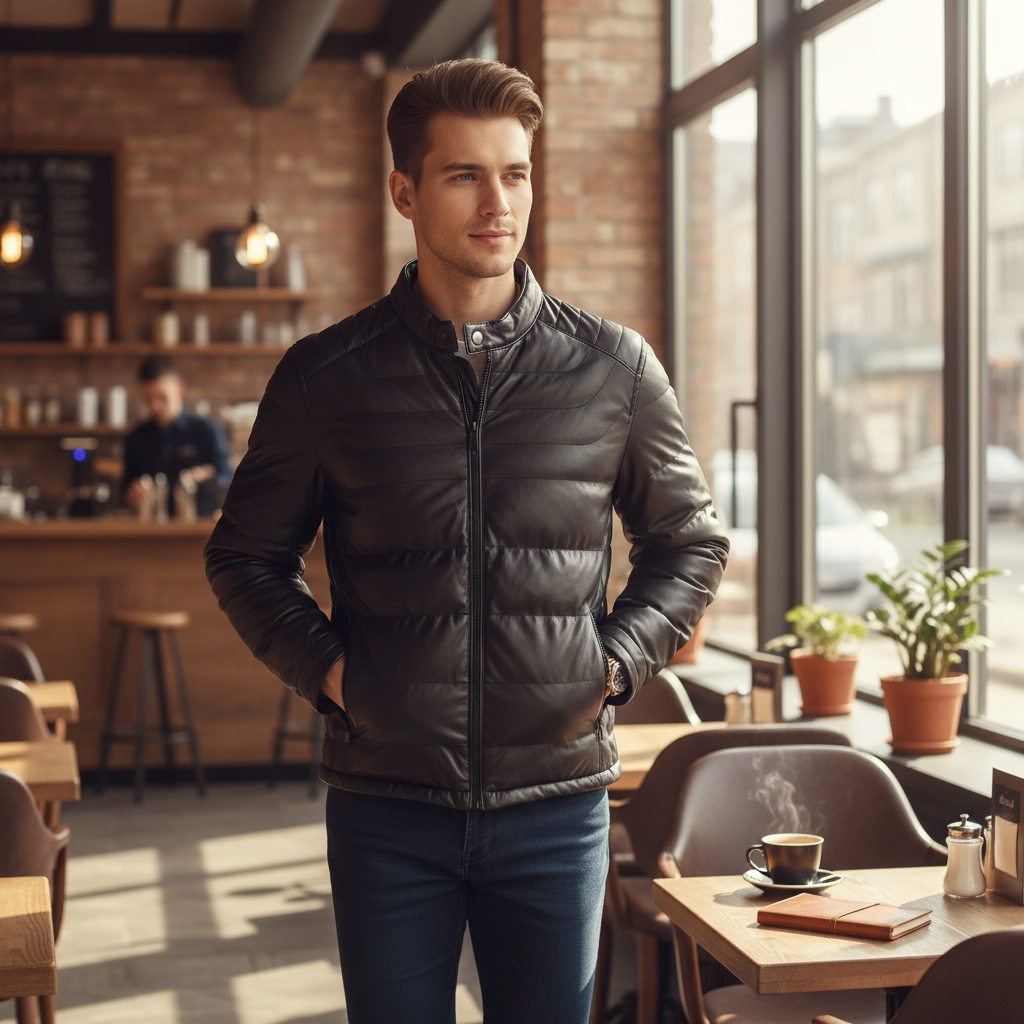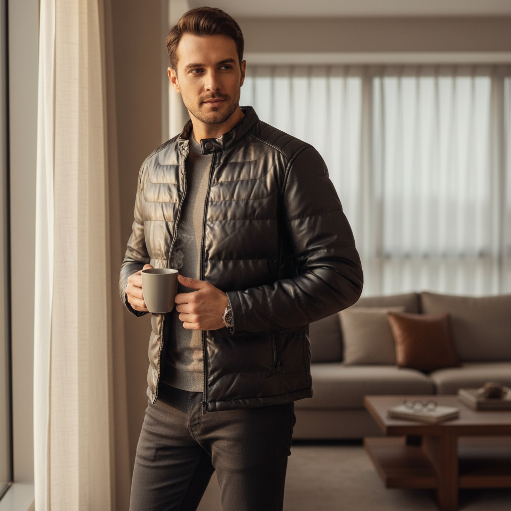 Design : Matelassage horizontal moderne avec empiècements structurés aux épaules pour une silhouette masculine affirmée.