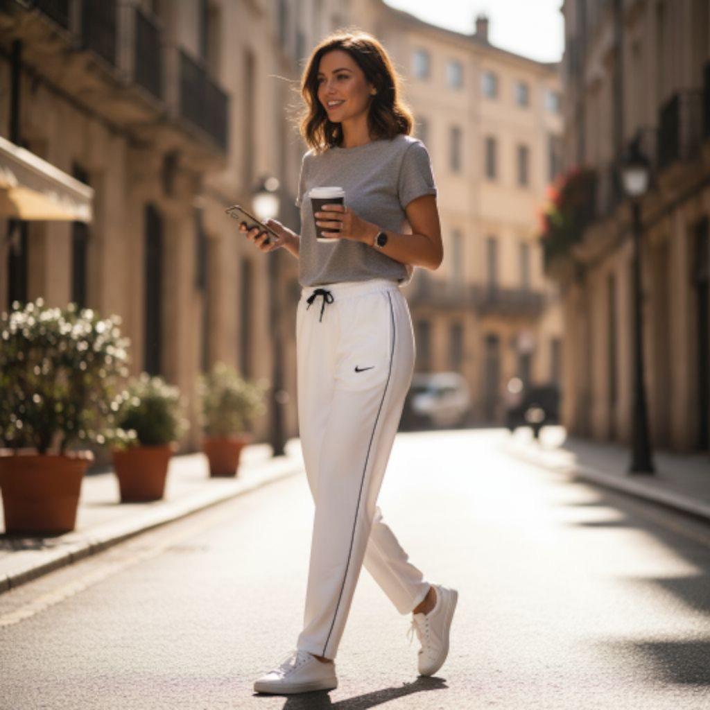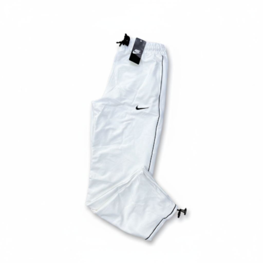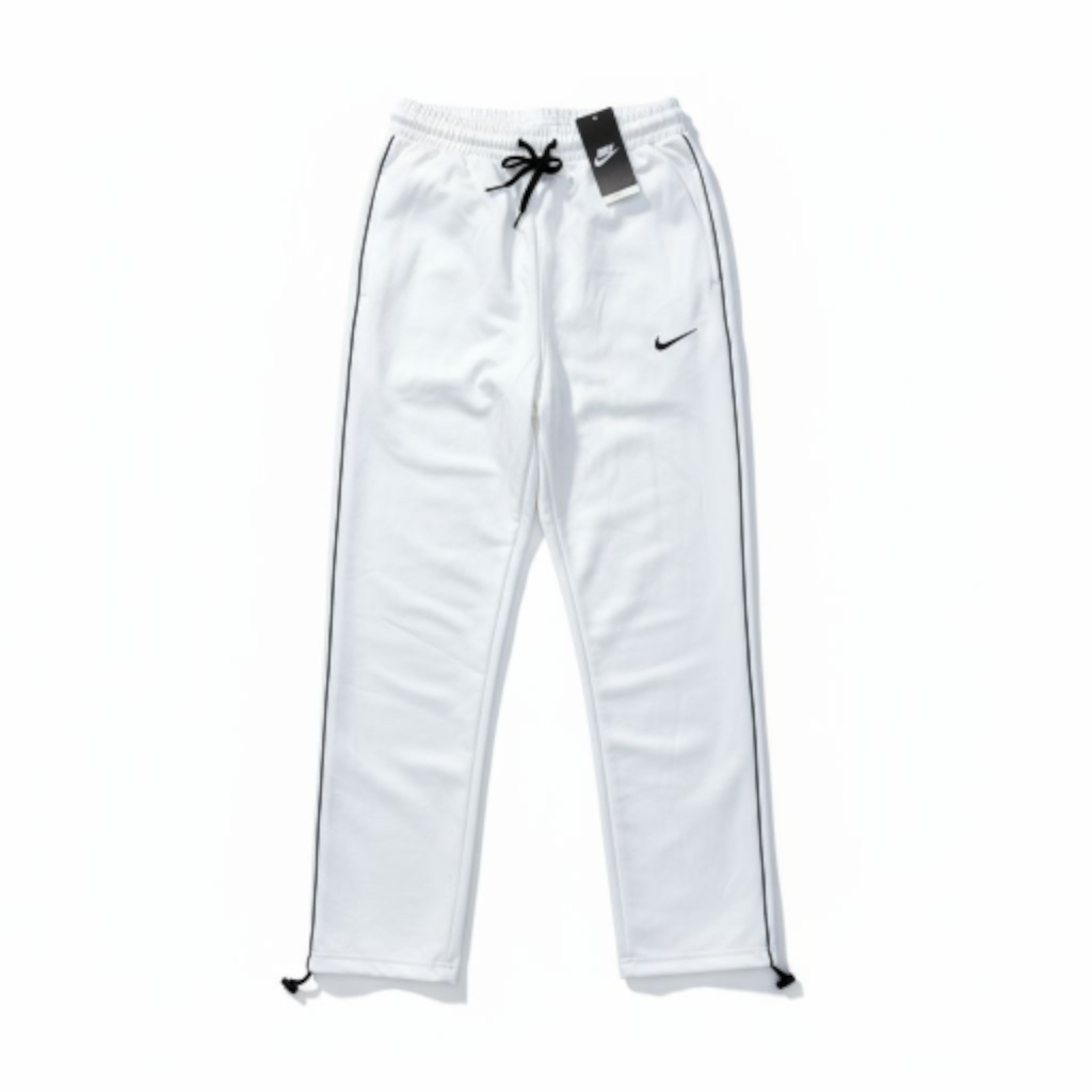 Couleur et Matière : D’un blanc éclatant, ce jogging est probablement fabriqué dans un tissu tissé léger et fluide (souvent du nylon ou du polyester), offrant un tombé parfait et une bonne résistance.