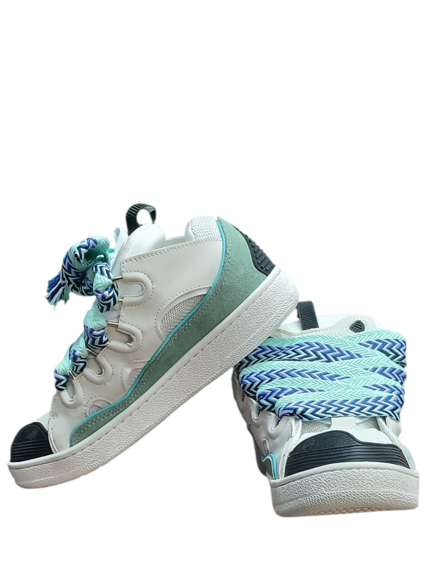 Les Lacets XXL : C’est l’élément signature du modèle. Ce sont des lacets doubles, extrêmement larges et tissés avec un motif en chevron (ici dans des tons de bleu et blanc), rappelant l’esthétique du skateboard old-school.
