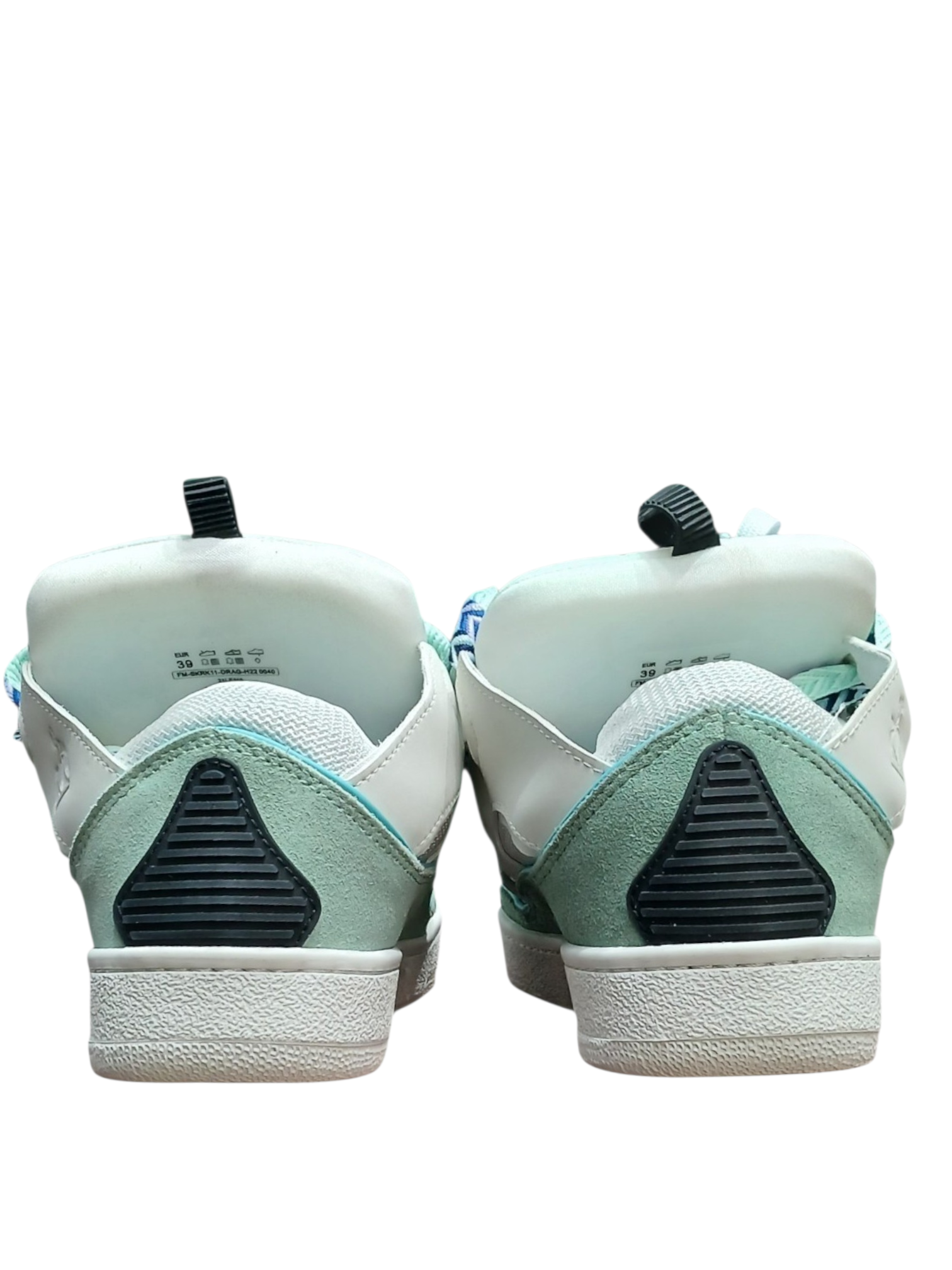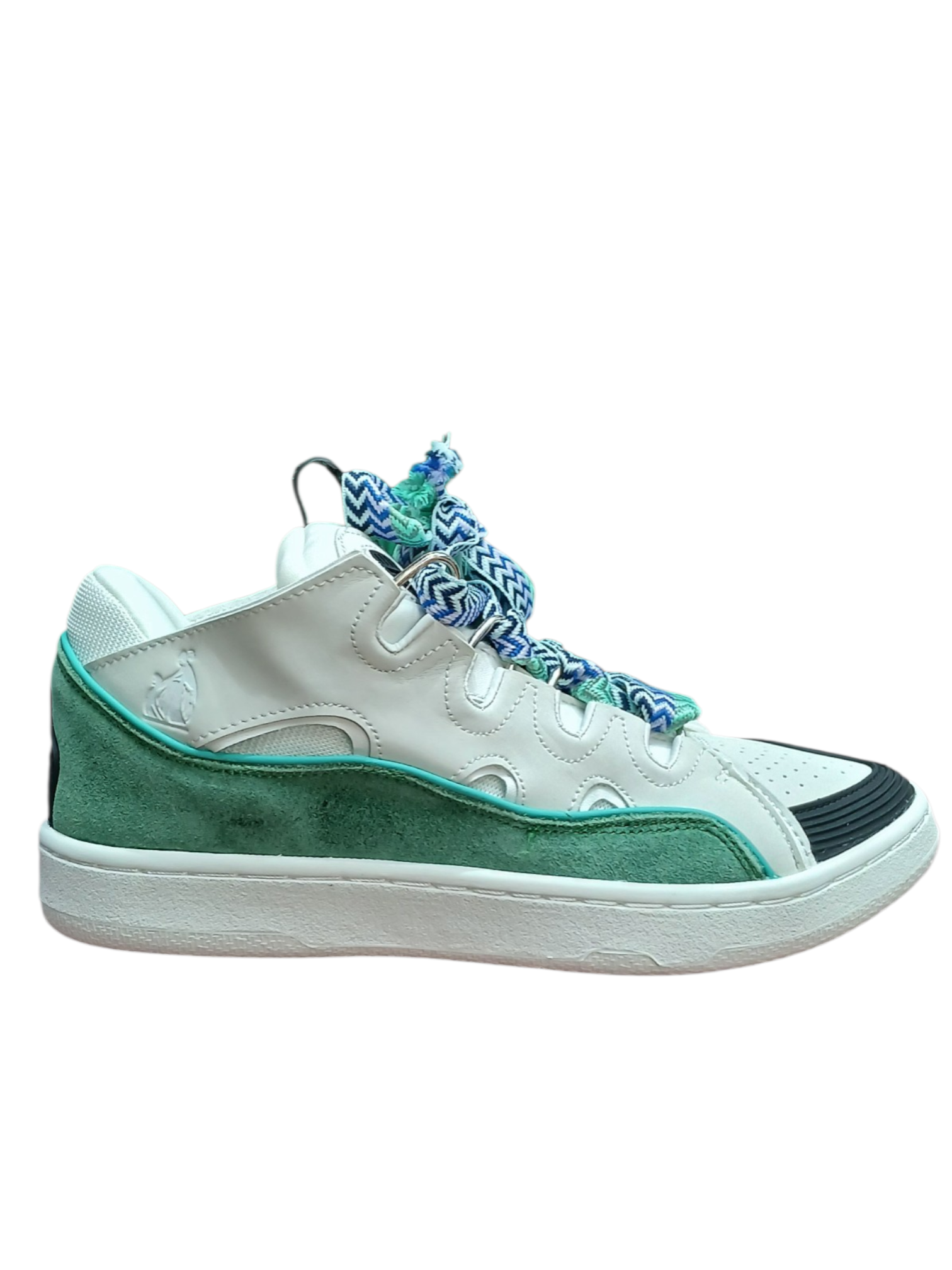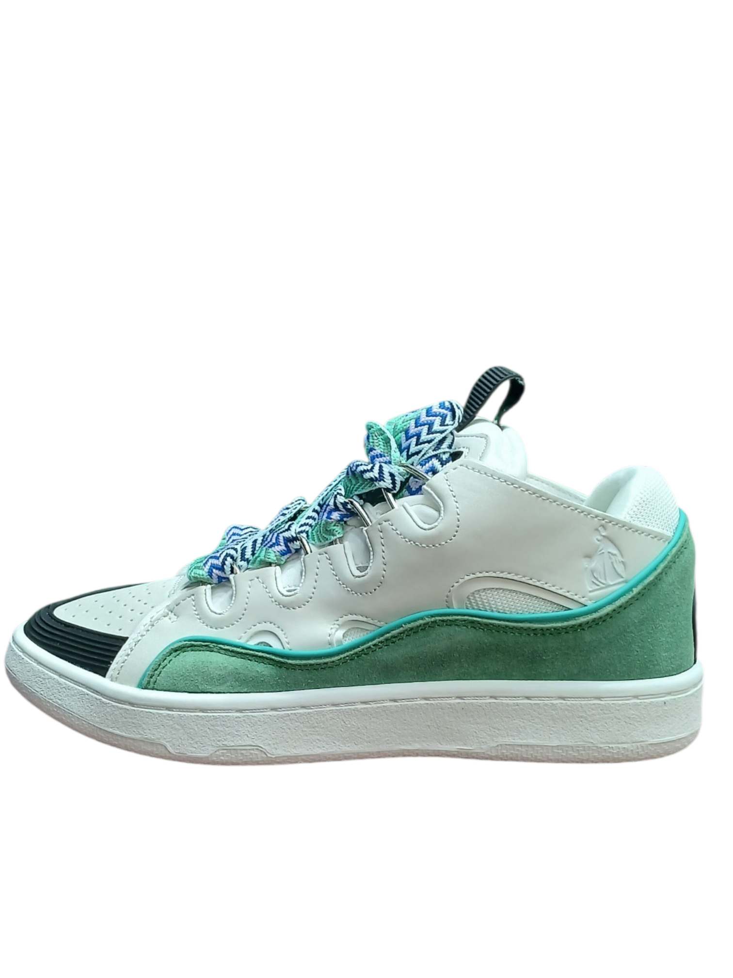 Coloris : Une base majoritairement blanche avec des accents de vert émeraude et de vert d’eau sur les empiècements latéraux en daim. La pointe du pied présente un renfort en caoutchouc noir texturé.