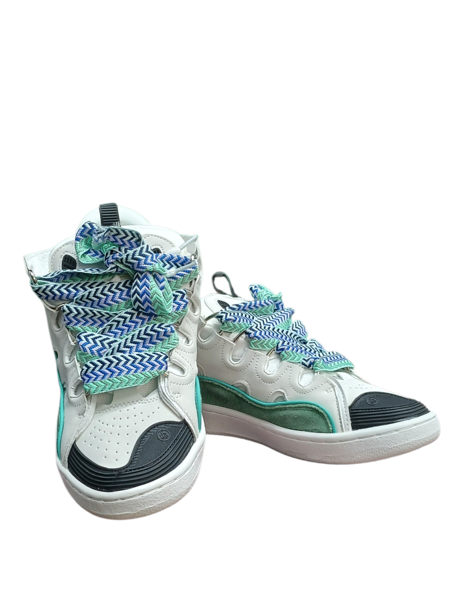 Lacets (Élément Signature) : Le détail le plus frappant est la paire de lacets extra-larges en chevron tissé. Ils arborent un motif complexe mélangeant des nuances de bleu, blanc et vert, créant un contraste dynamique avec le reste de la chaussure.