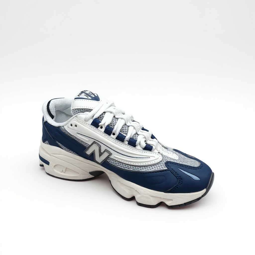 • Design : L’empeigne combine du mesh gris avec des superpositions en cuir crème et des empiècements bleu marine.