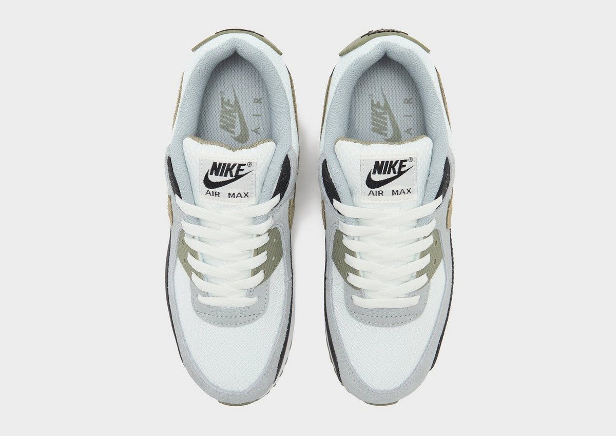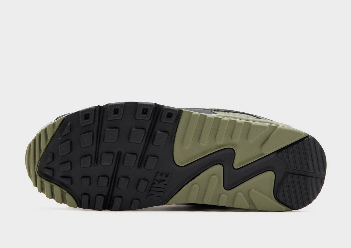 Détails caractéristiques : On retrouve les éléments en TPU (plastique nervuré) typiques de la AM90 au niveau des œillets et du talon, déclinés ici dans un ton vert olive/kaki.