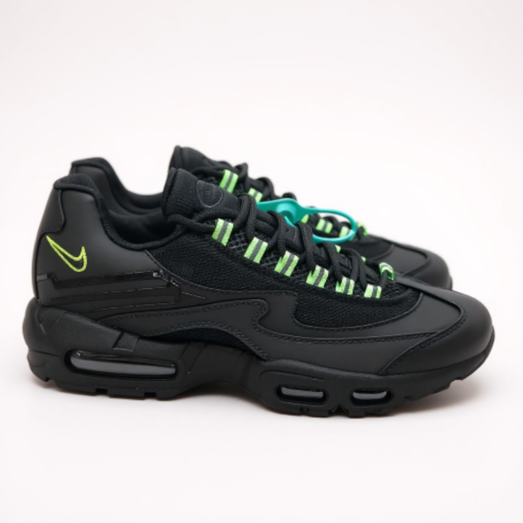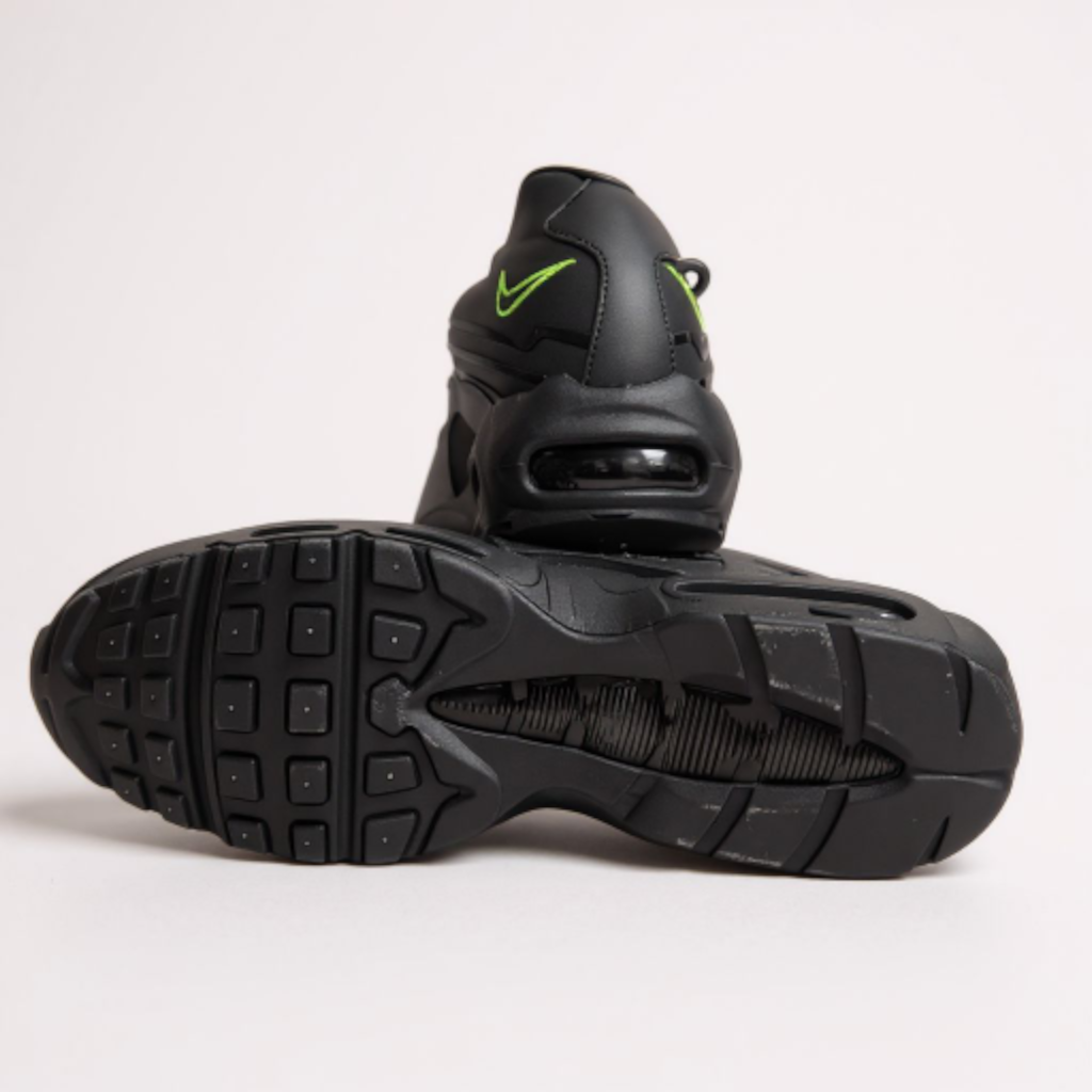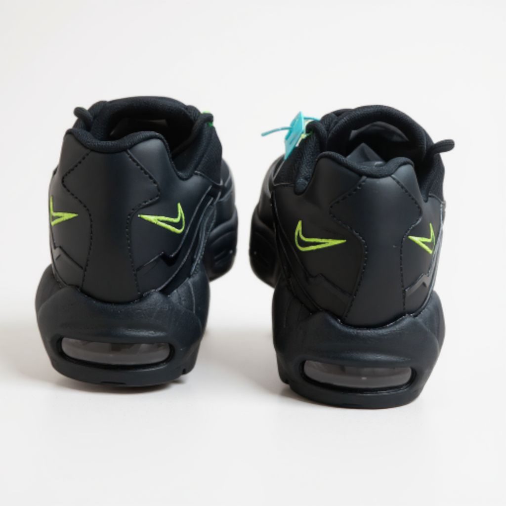 Design Anatomique et Imposant : La silhouette de la AM95 est immédiatement reconnaissable, avec ses lignes ondulées et ses multiples empiècements superposés. Le coloris présenté est une version moderne et puissante « Triple Black » relevée par des touches « Neon » (vert fluorescent) sur les œillets, les logos Swoosh au talon et à l’avant, injectant un