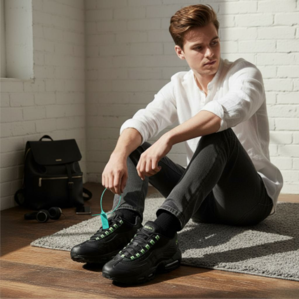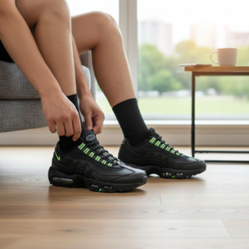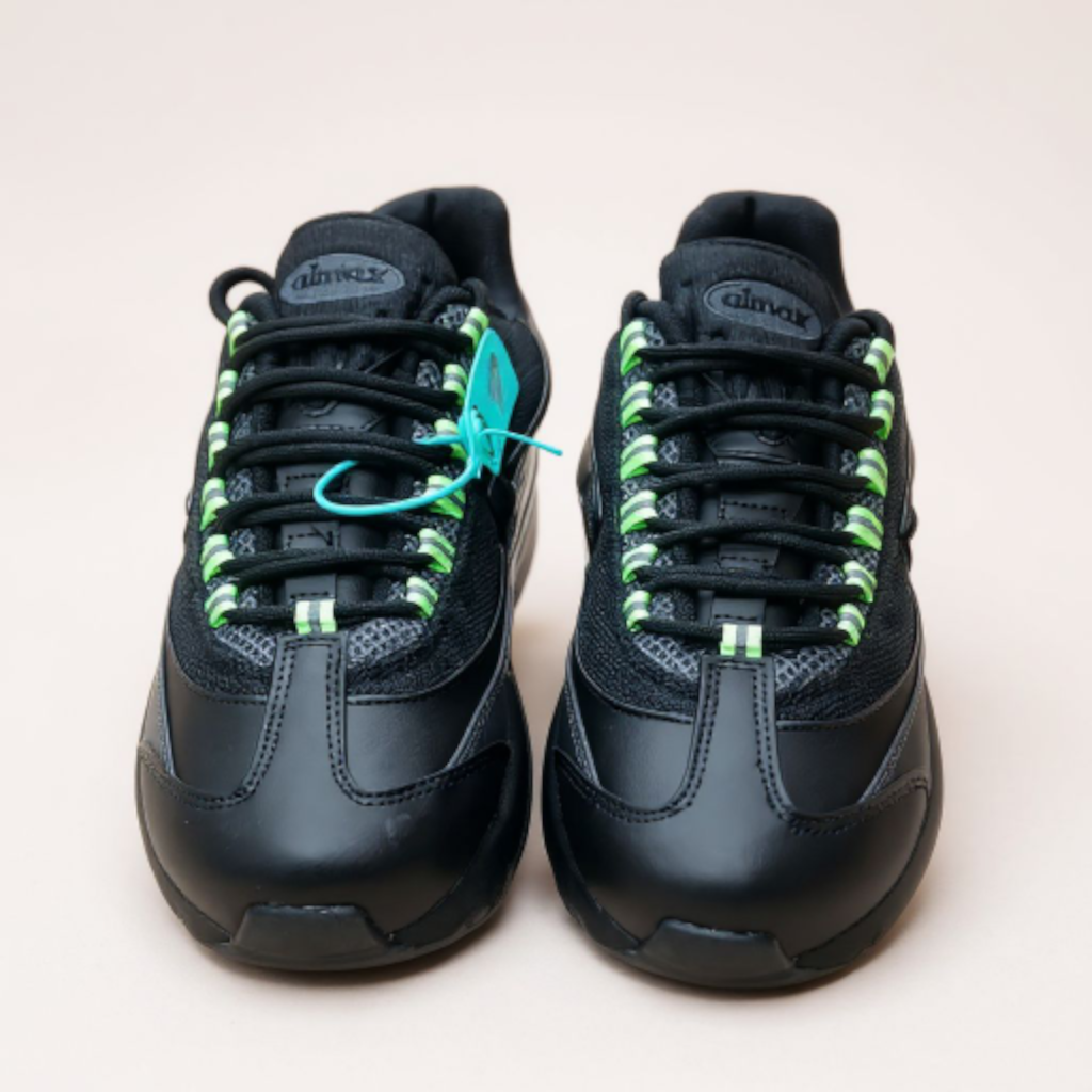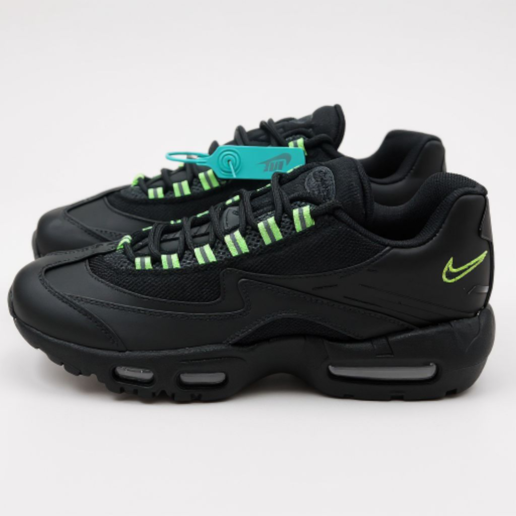 Design Anatomique et Imposant : La silhouette de la AM95 est immédiatement reconnaissable, avec ses lignes ondulées et ses multiples empiècements superposés. Le coloris présenté est une version moderne et puissante « Triple Black » relevée par des touches « Neon » (vert fluorescent) sur les œillets, les logos Swoosh au talon et à l’avant, injectant un