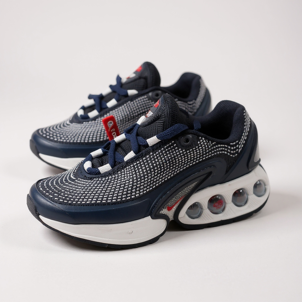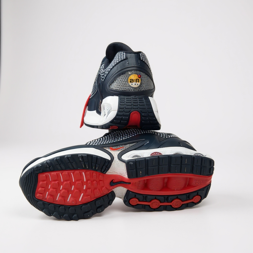 Détails signatures : Logo « Air Max DN » circulaire sur le talon et la languette, avec une semelle extérieure bicolore rouge et marine pour un contraste saisissant.