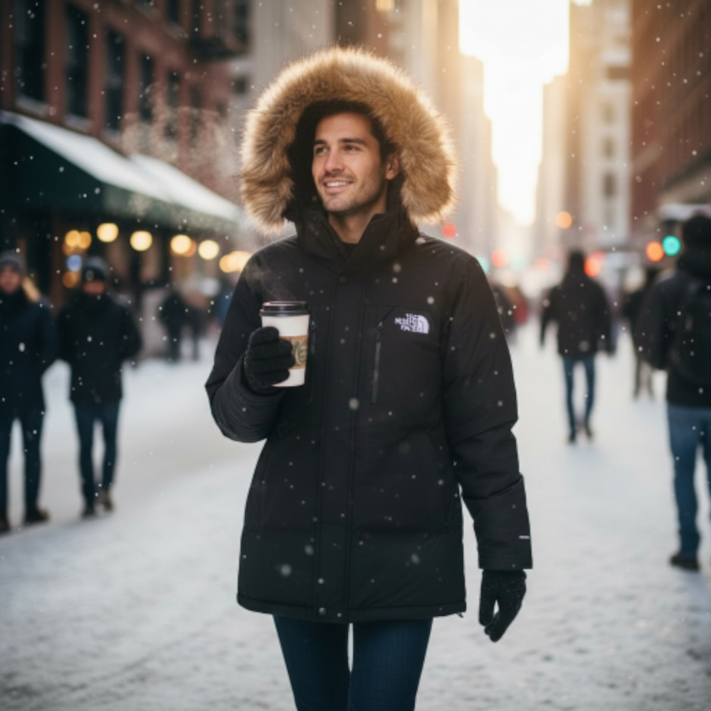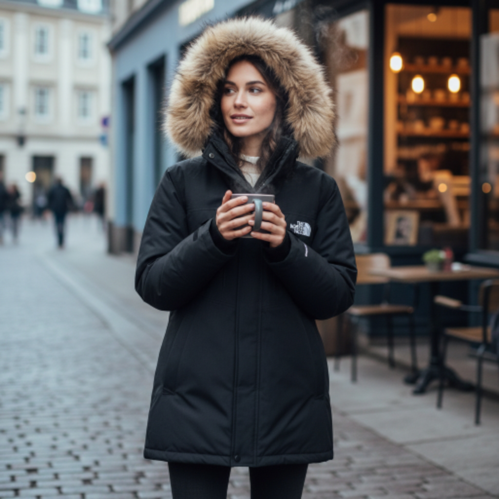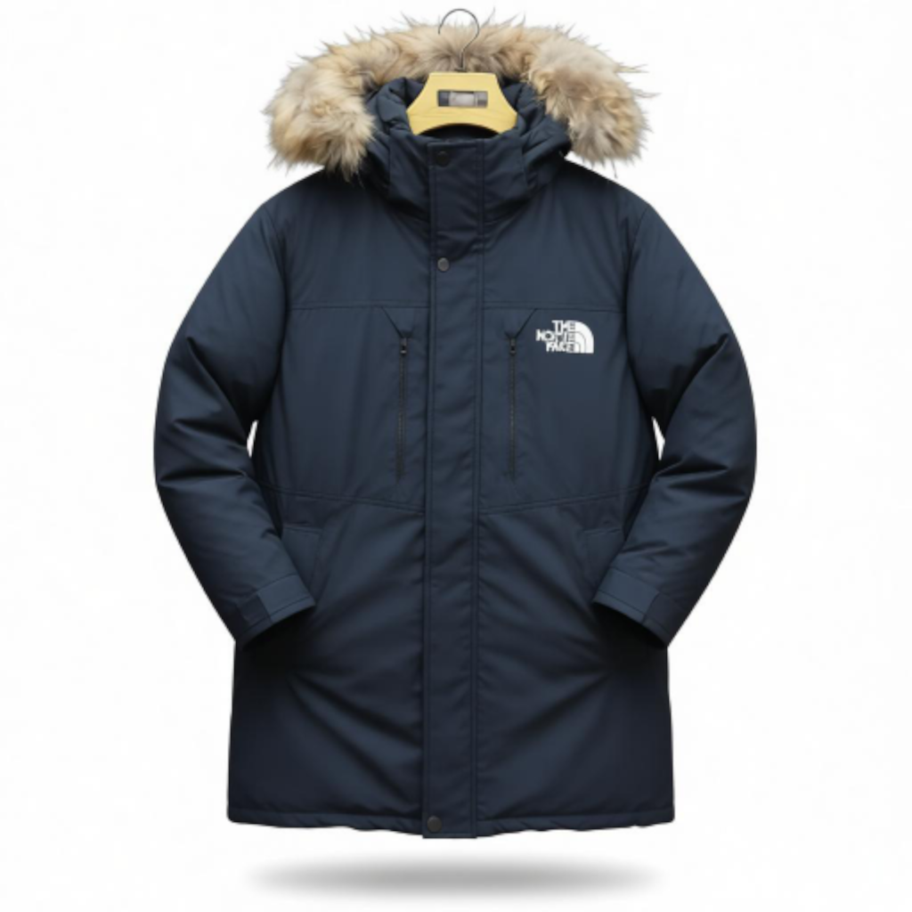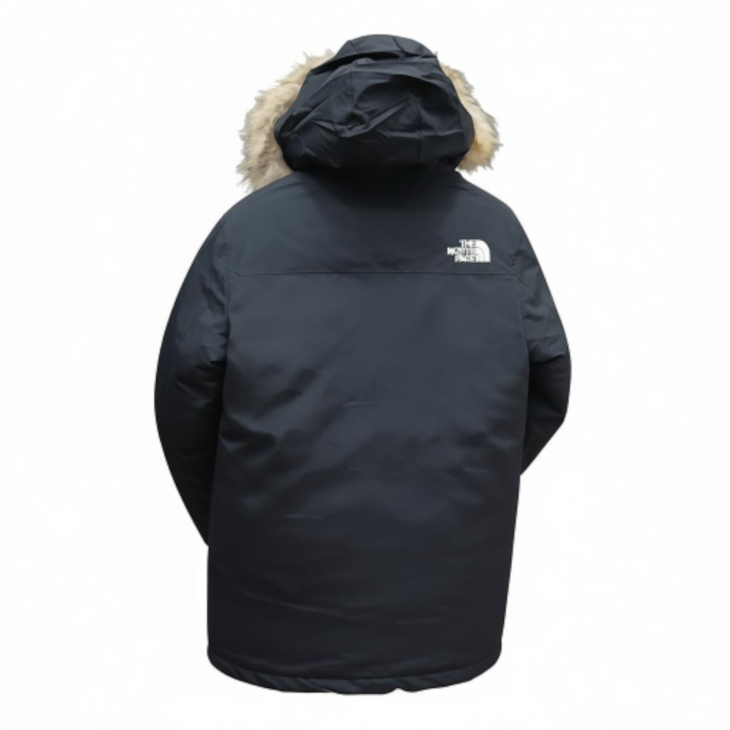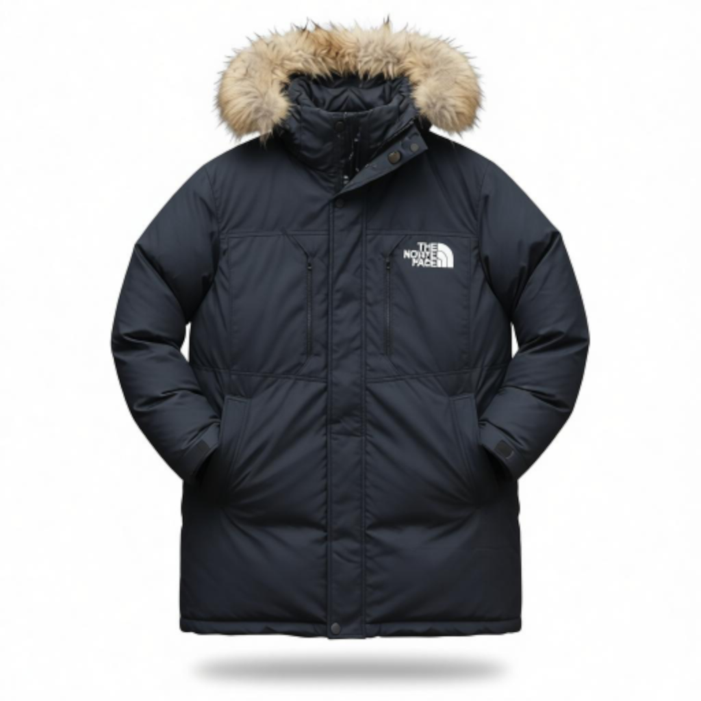 Capuche : Grande capuche rembourrée, dotée d’une bordure amovible en fausse fourrure de couleur naturelle (beige/marron), ajoutant une isolation supplémentaire et un style emblématique.