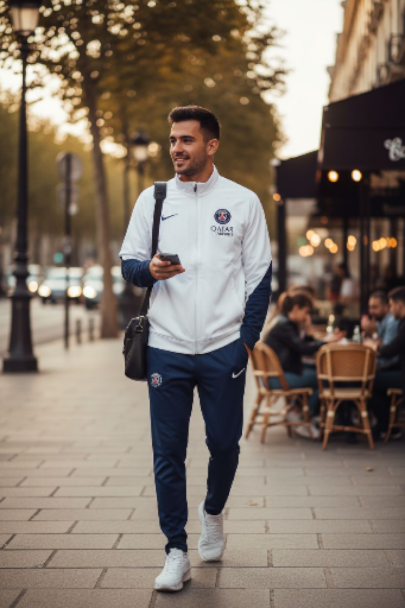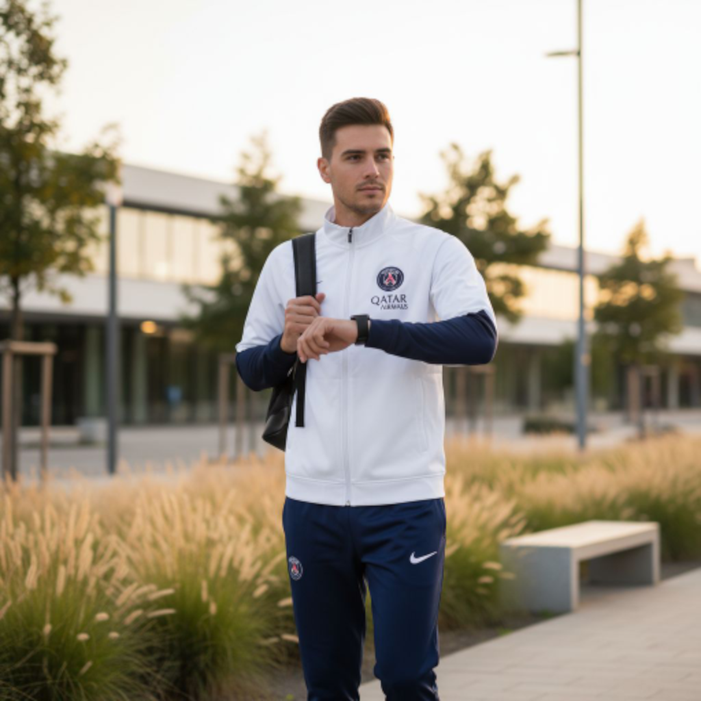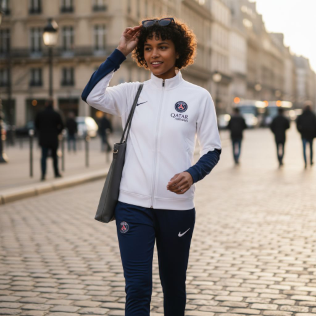 Survêtement Nike PSG blanc et bleu marine, confortable et élégant. Ensemble officiel avec logos brodés, parfait pour l’entraînement ou un look urbain stylé.