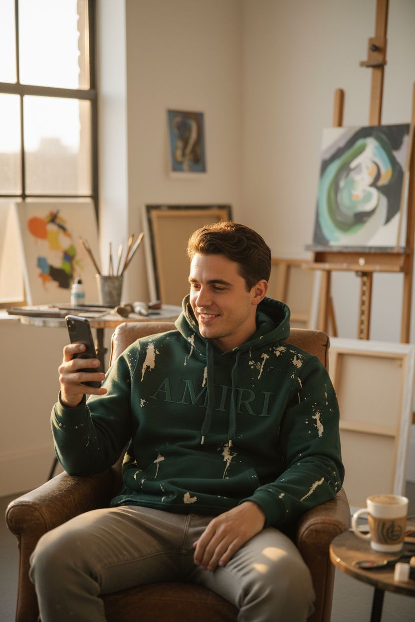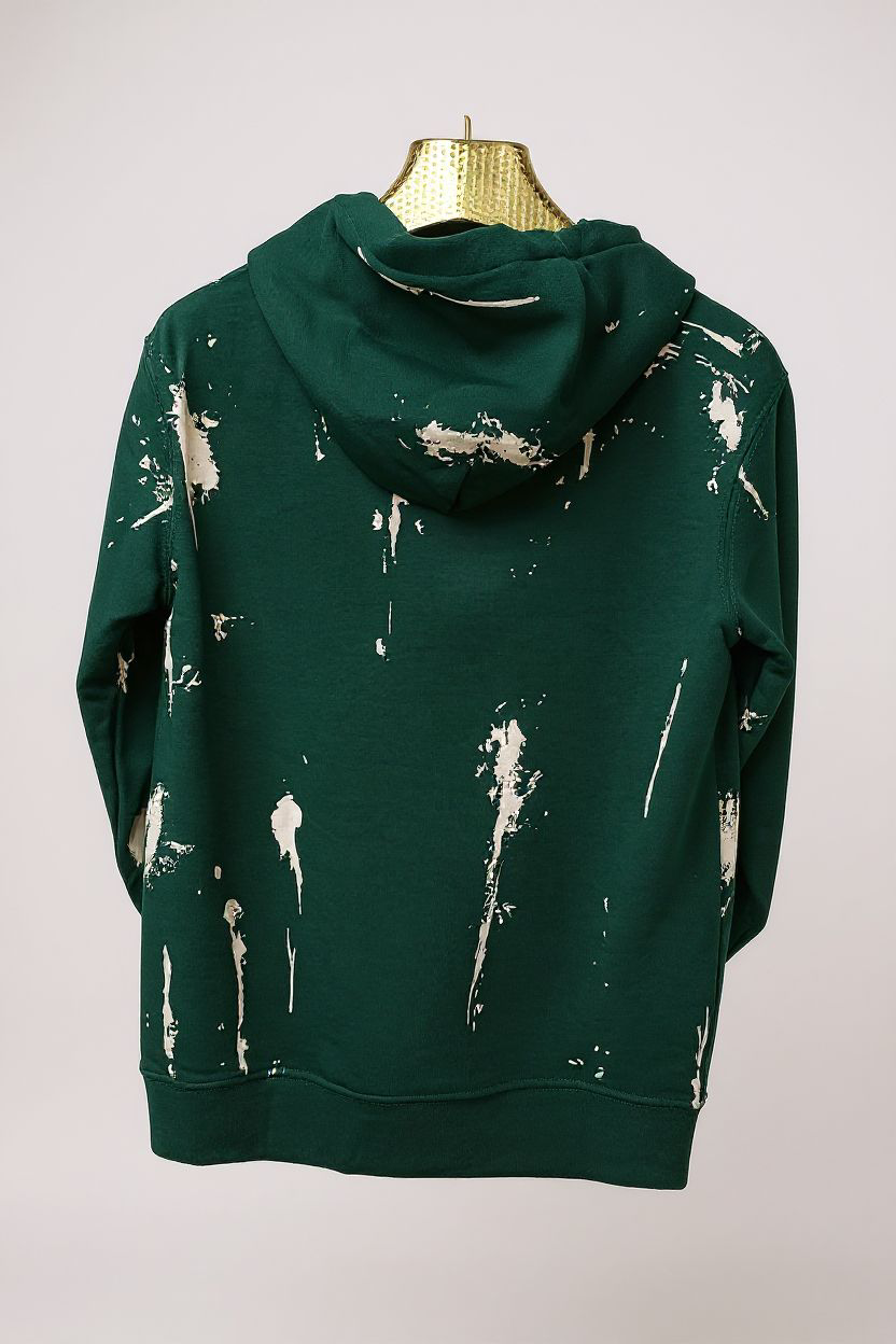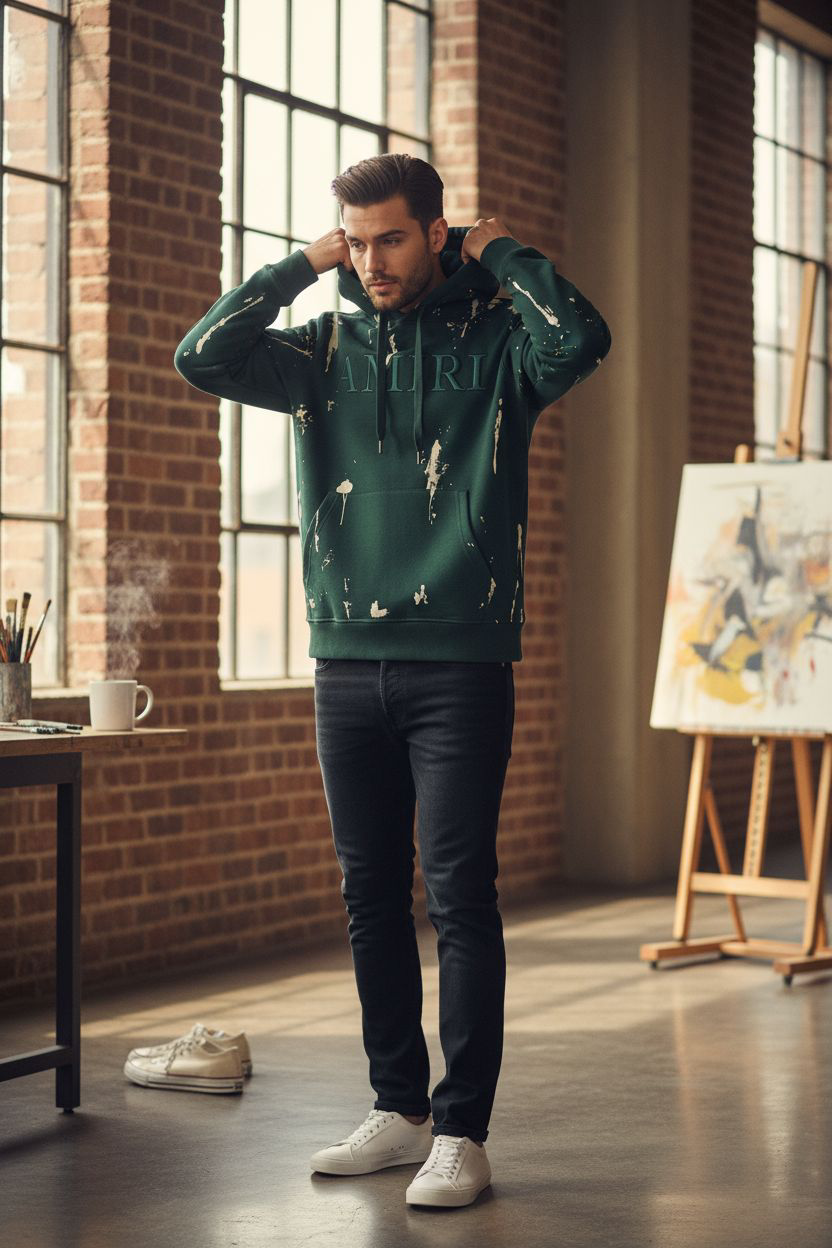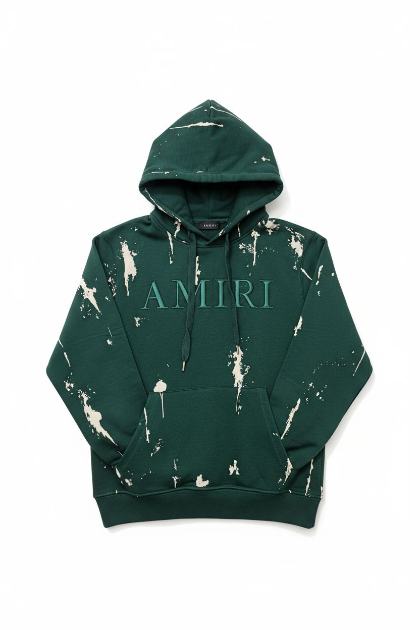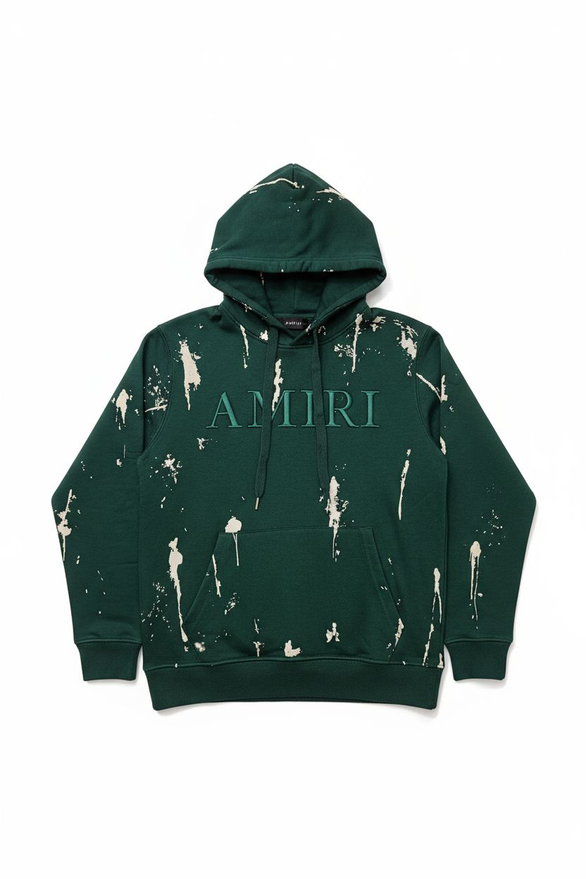 Affichez un style urbain raffiné avec ce sweat à capuche AMIRI vert profond, orné d’un effet éclaboussures de peinture unique. Confectionné dans un coton premium doux et résistant, il allie confort et design contemporain. Le logo AMIRI brodé sur la poitrine apporte une touche de luxe reconnaissable, tandis que la coupe décontractée et la poche kangourou assurent un port agréable au quotidien.