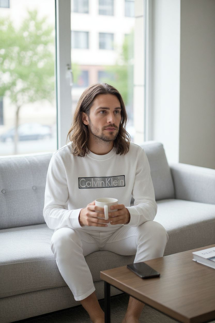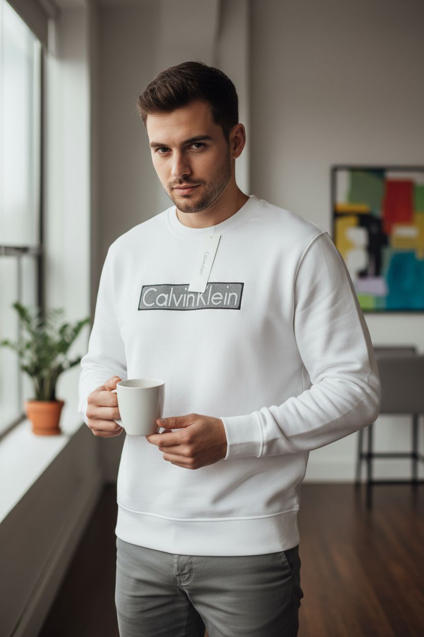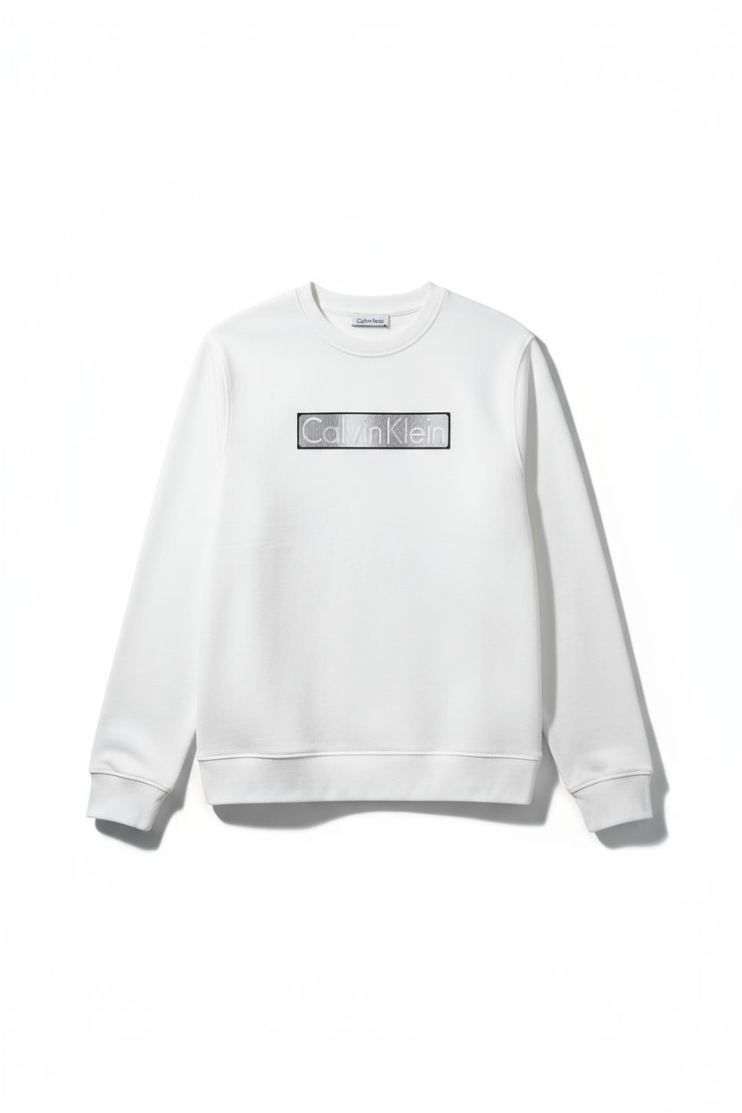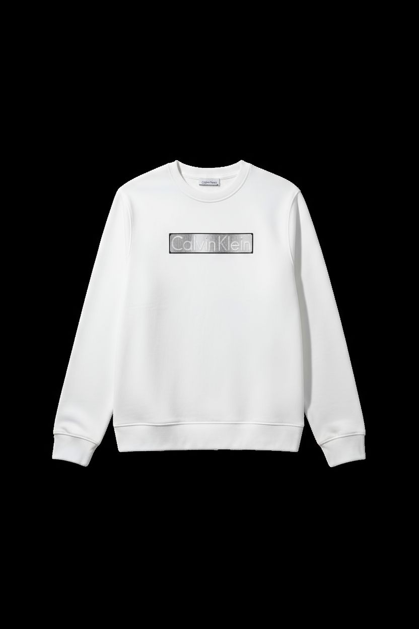 Design Principal : Le devant est orné du célèbre logo Calvin Klein encadré dans un rectangle, créant un contraste subtil et moderne. Le lettrage est souvent en relief ou avec un effet de brillance/dégradé métallique (argenté ou gris clair) qui capte la lumière.