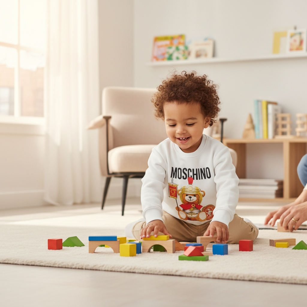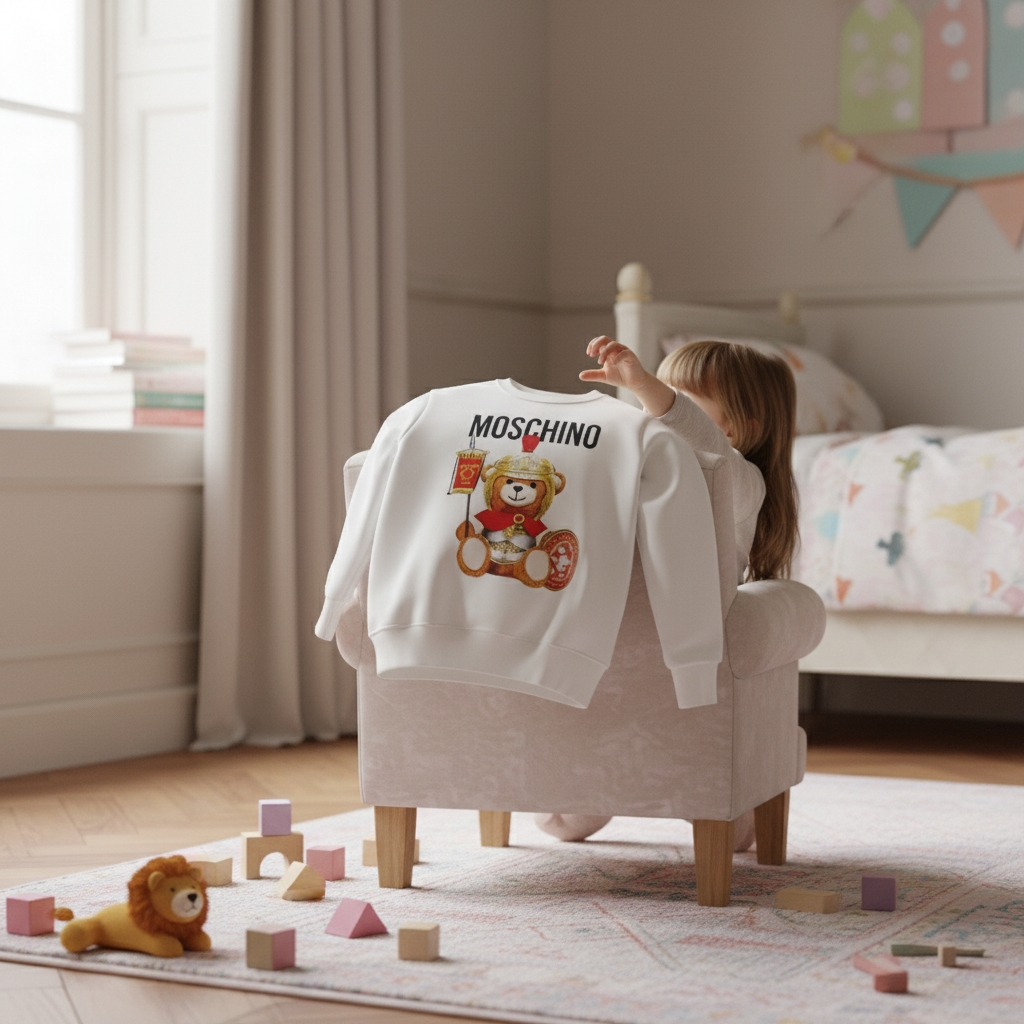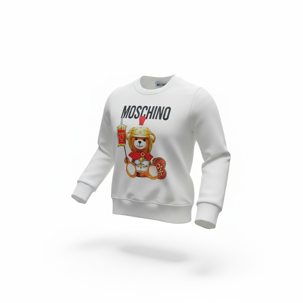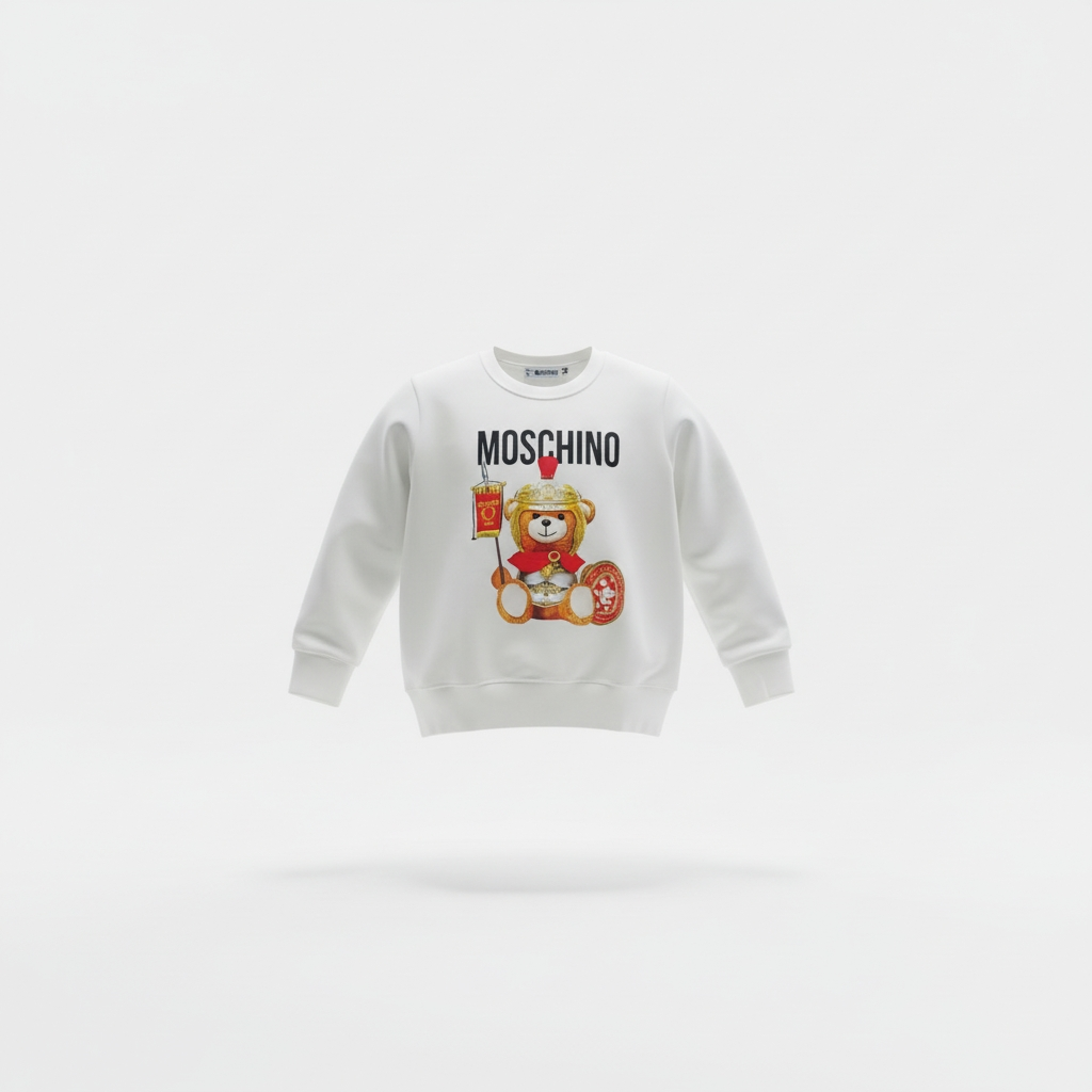 Apportez une touche d’humour et de luxe à la garde-robe de votre enfant avec ce sweat-shirt Moschino emblématique. Ce modèle blanc éclatant met en scène le célèbre Teddy Bear de la maison italienne, déguisé pour l’occasion en centurion romain, complet avec casque doré et bouclier.
