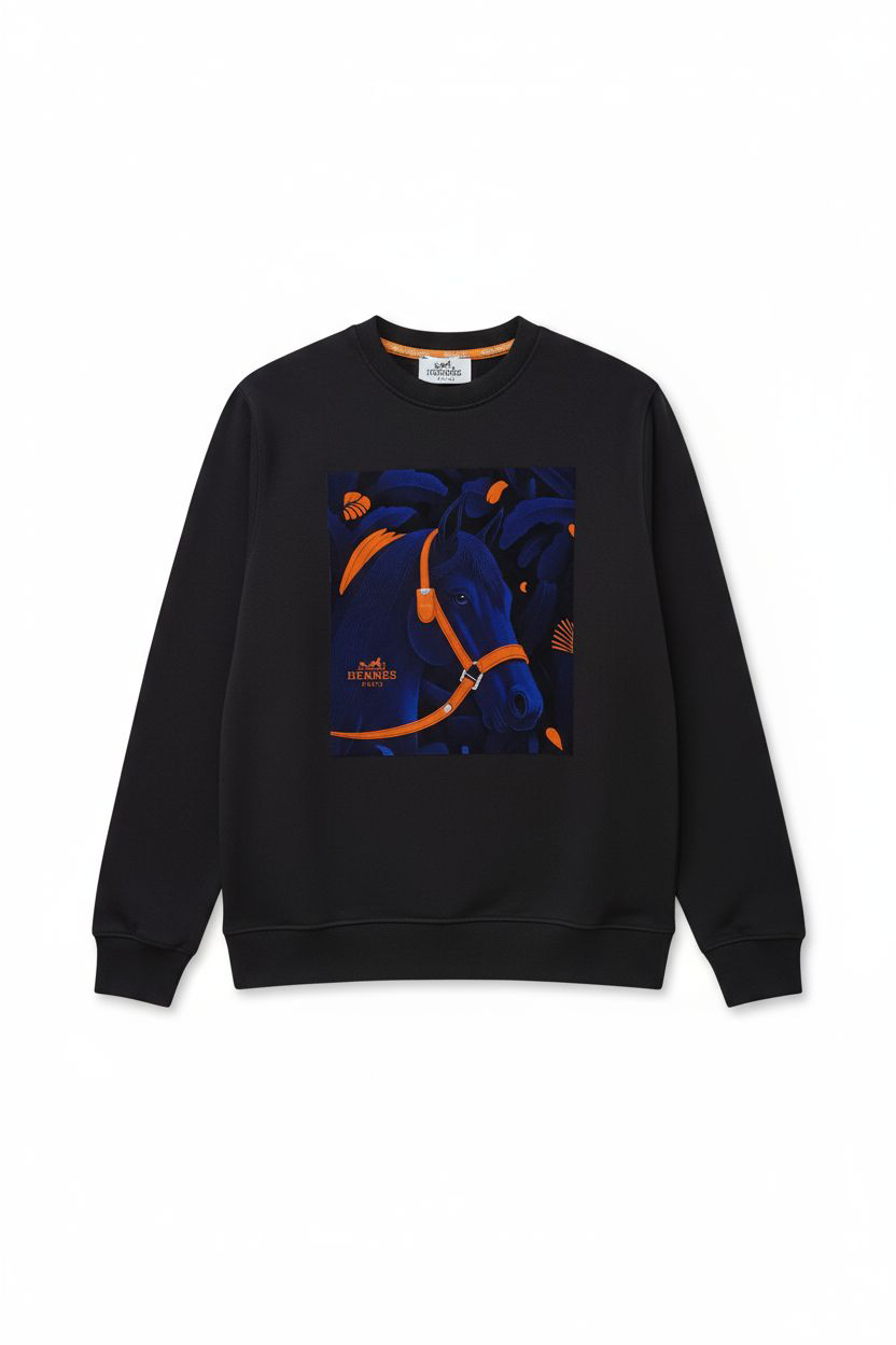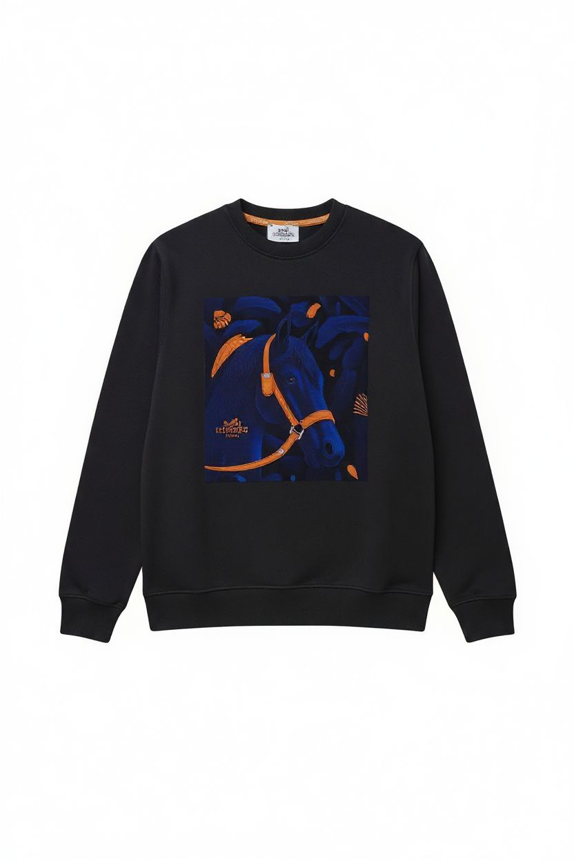 L’illustration met en scène un portrait de cheval majestueux, baigné de nuances de bleu profond et d’outremer, évoquant une scène nocturne et mystérieuse. Le contraste est magistralement créé par les touches d’orange vif (sur la bride du cheval et les motifs floraux de l’arrière-plan), qui apportent une luminosité ardente à l’ensemble.