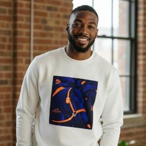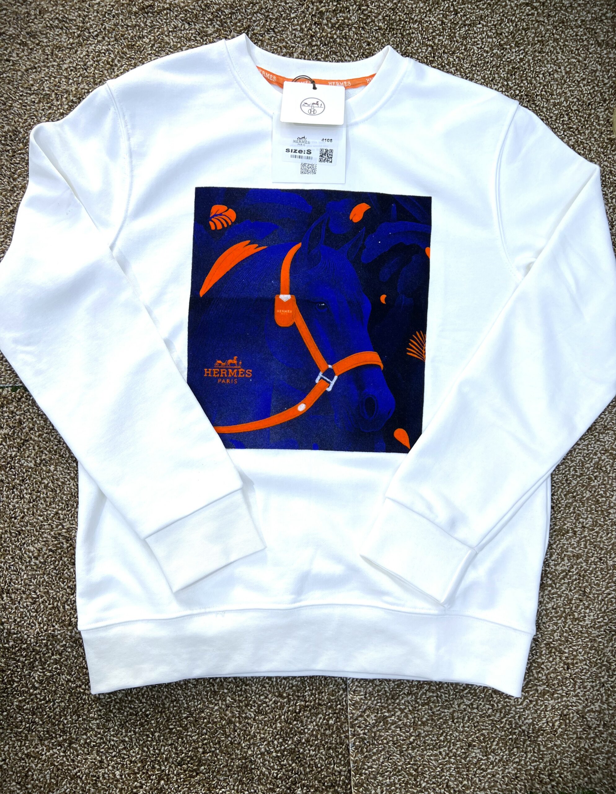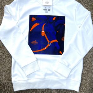 Découvrez ce superbe sweatshirt Hermès de luxe, alliant confort et élégance intemporelle. Confectionné dans un coton doux et respirant, il arbore une coupe moderne à col rond et des finitions soignées aux poignets et à la taille. Son design unique met en valeur un magnifique imprimé artistique représentant un cheval, symbole iconique de la maison Hermès, dans des tons bleu nuit et orange éclatant.