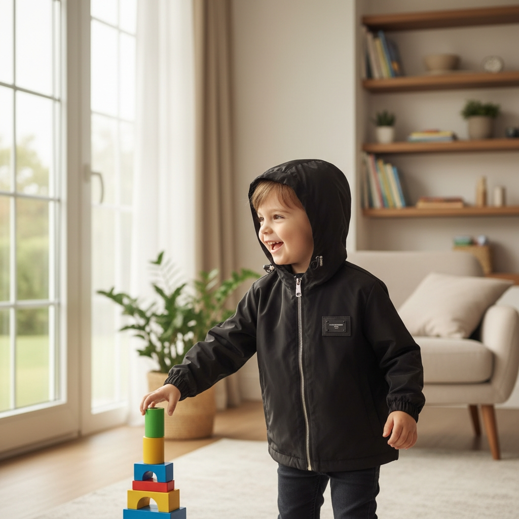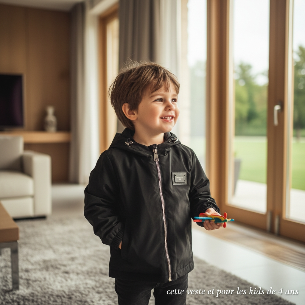 Cette veste à capuche combine le savoir-faire du luxe avec les besoins quotidiens des enfants. Son tissu technique offre une barrière légère contre les éléments tout en restant respirant.