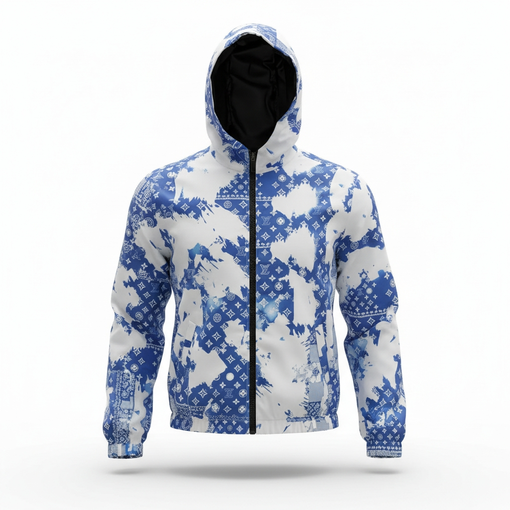 Design Audacieux : Un contraste saisissant entre le blanc éclatant et un bleu électrique, décoré de motifs monogrammes et d’effets graphiques « bandana » pour un style résolument actuel.