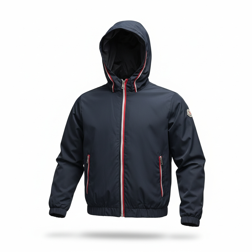 Design & Style : Une coupe droite moderne en bleu marine profond, rehaussée par des bandes contrastées rouges et blanches sur la fermeture éclair centrale et les poches latérales. Le logo distinctif sur la manche apporte une touche de prestige.
